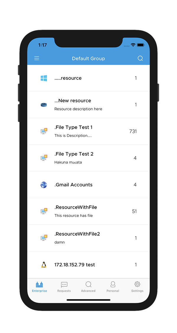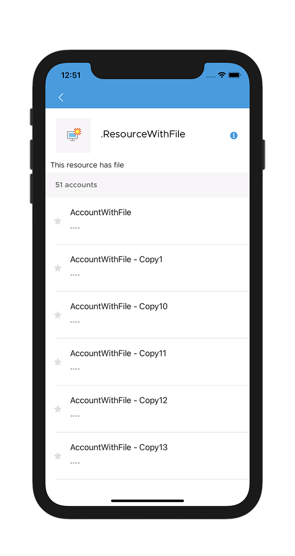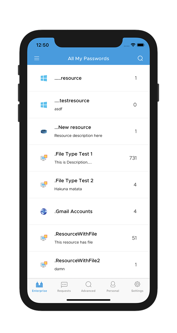 このカテゴリには、あなたが所有および管理するすべてのリソースとアカウントが一覧表示されます。リソース/アカウント名をタップして、リソース所有者、リソー スURL、DNS名、リソースの種類、パスワード、リソース名、アカウントメモ、および最期にアクセスした時刻等、リソース/アカウントの詳細を表示します。.特定アカウントのパスワードを表示するには、そのパスワードの横にある[目]アイコンをタップします。[検索]アイコンをタップして、検索キーワードを使って、選択したリソース内のアカウントを検索します。