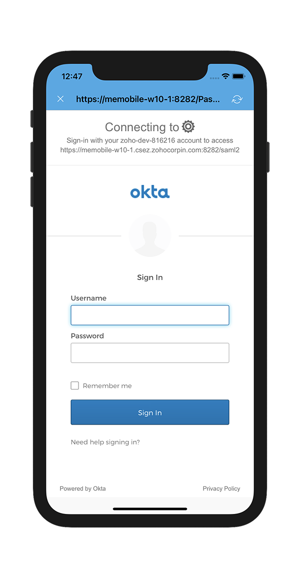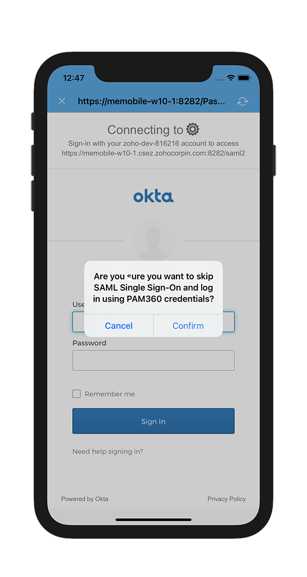 - ログインするには、PAM360アカウントのユーザー名とパスワードを入力します。iOSアプリケーションは、3つの認証方法yをサポートしています:PAM360のネイティブ認証からログイン、Active Directory/LDAP/Azure AD認証から、およびSAML SSO経由のログイン。Active Directory/LDAP認証情報を使ってログインするには、ドメイン名をドロップダウンリストから選択します。SAMLシングルサインオンがPAM360 Serverで有効になっている場合、ブラウザウインドウはアプリケーション内で開きます。