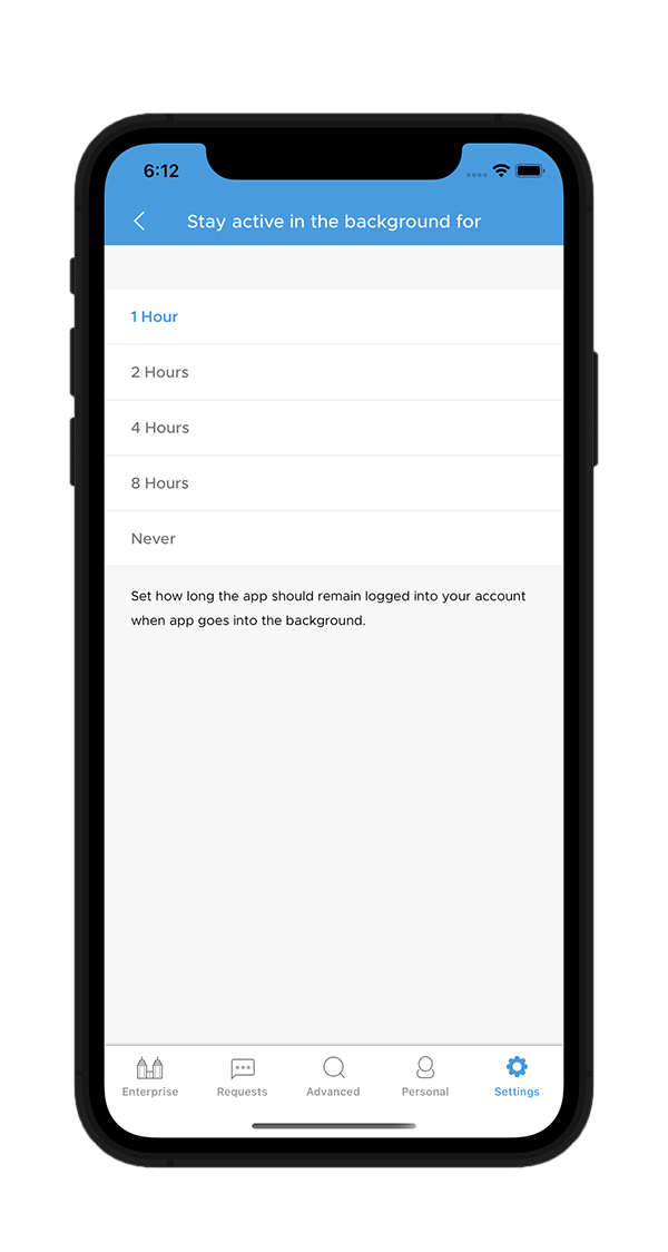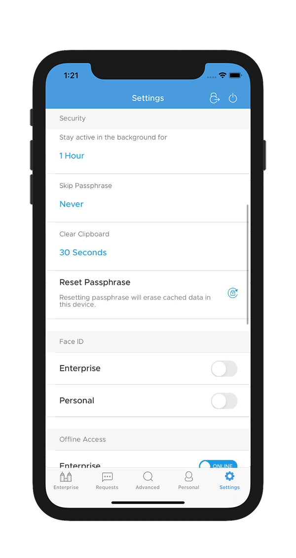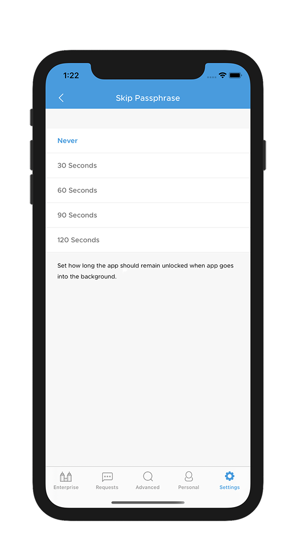 ログアウトしないでアプリケーションを離れる場合、例えば短期間でも、パスフレーズを再入力して復帰するように求められます。アプリケーションが背景で実行されているときに、パスフレーズの入力を求めない期間を設定します。30~120時間の期間を選択できます。また、[しない]をタップすると、ログイン中は必ず、パスフレーズが求められます。