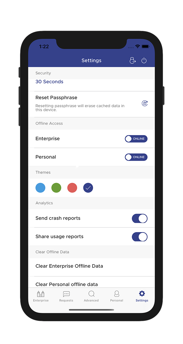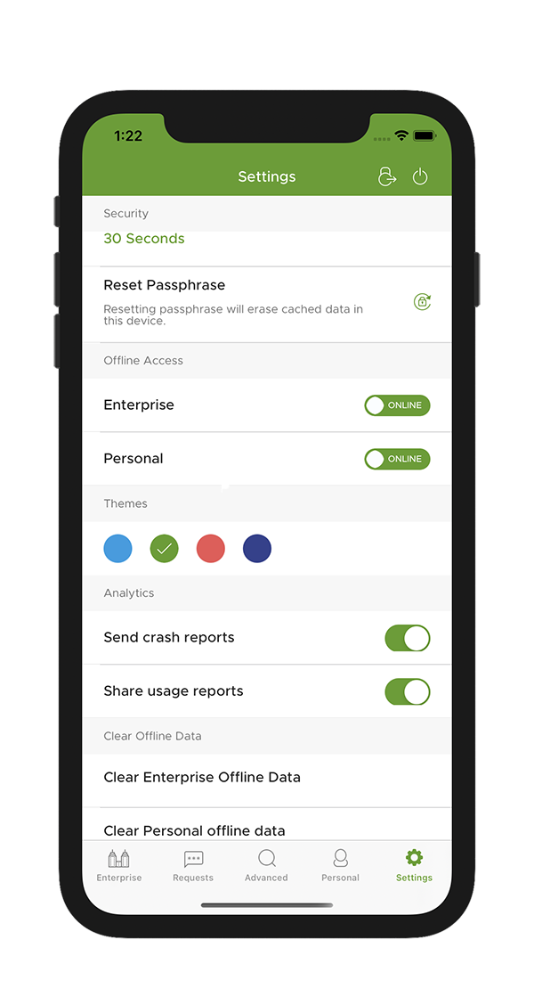 エンタープライズオフラインデータを消去 - このオプションをタップして、すべてのオフラインキャッシュを消去します。この操作では、オフラインで保存されたすべてのエンタープライズパスワードが削除されます。