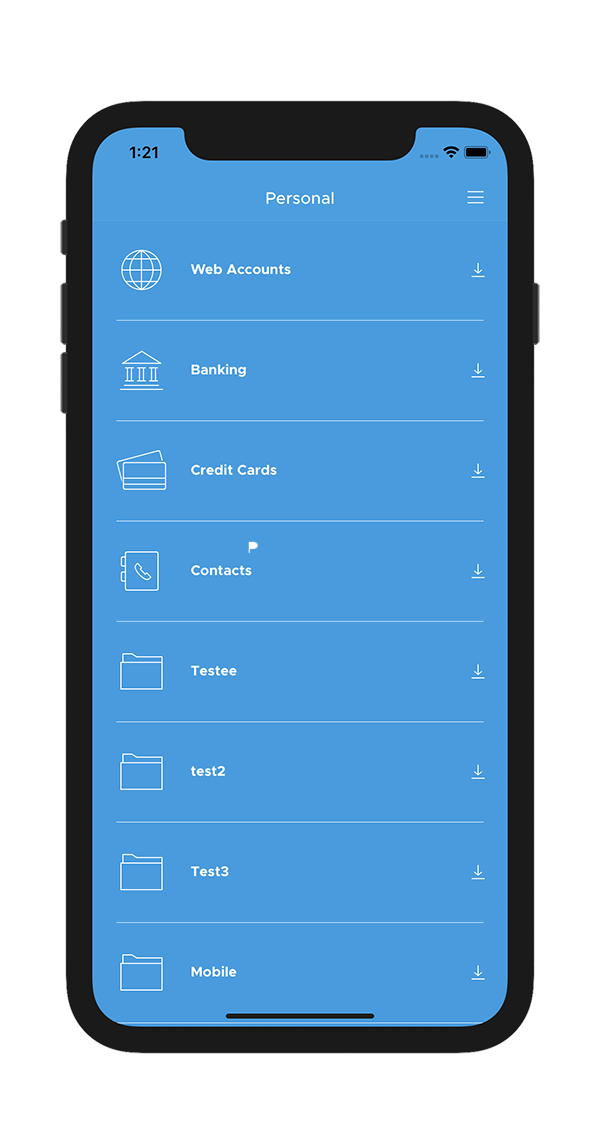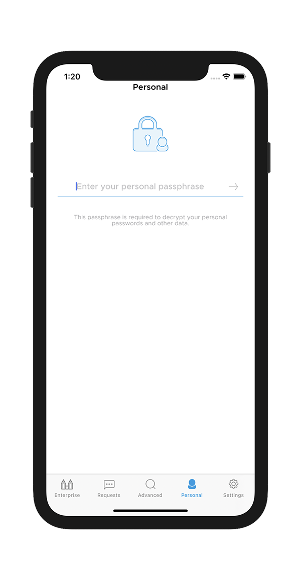 個人タブを終了するには、右端上の[ロック]アイコンをタップします。すべてのマイパスワードセクションに戻ると、個人タブがロックされます。個人タブにもう一度入力するには、パスフレーズをもう一度入力する必要があります。