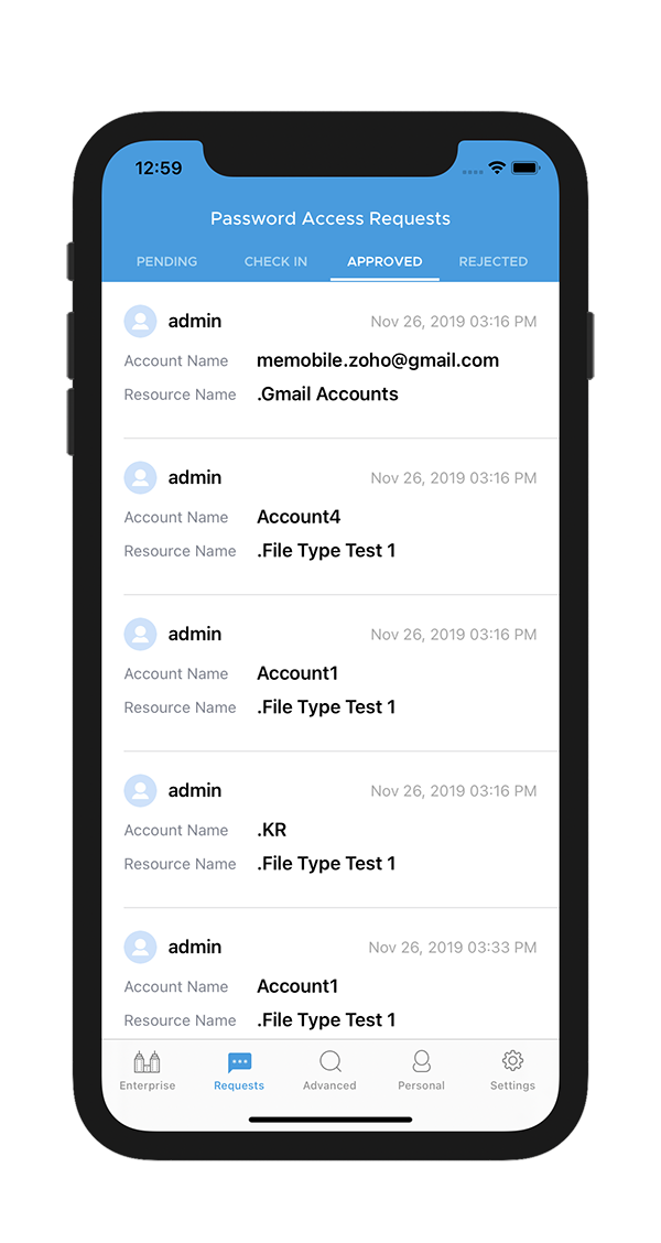 - パスワード要求を承認/拒否、およびパスワードのチェック者をPAM360 iOSアプリケーションから直接監視します。また、パスワード要求を送信し、モバイルアプリケーションからパスワードのチェックインとチェックアウトを実行します。