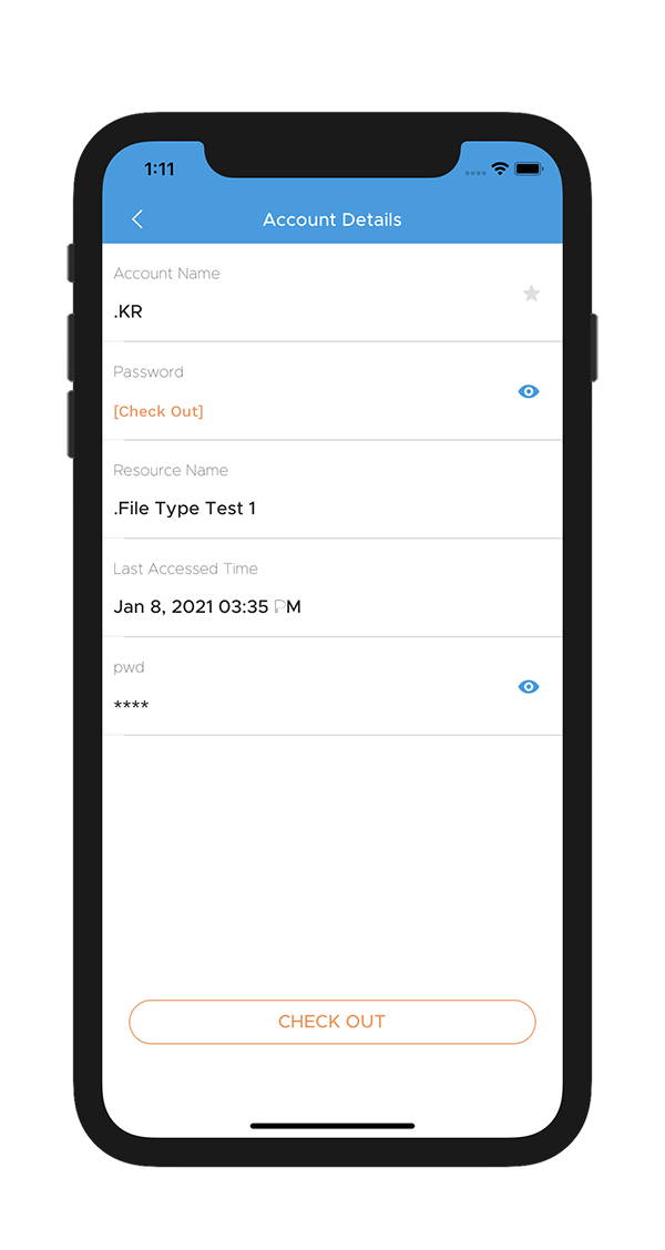 管理者がパスワード要求を承認したら、その旨通知され、パスワードはチェックアウトで利用できるようになります。.使用するためパスワードをチェックアウトしたら、ステータスは使用中に変更されます。他のユーザーは、チェックインタブと、特定アカウントのアカウント詳細セクションの両方でこのステータス変更を確認できます。パスワードへのアクセスをやめるには、[チェックイン]オプションをタップします。これで、パスワードはPAM360 vaultでのチェックインに戻ります。