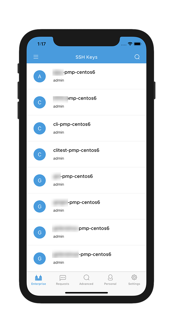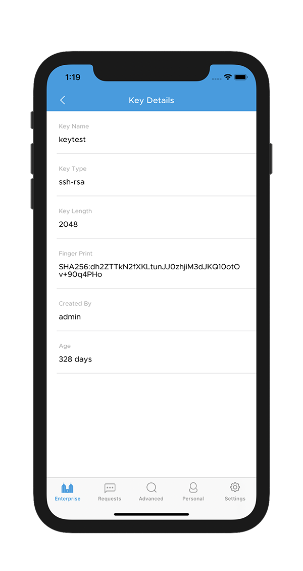 エンタープライズメニューのSSHキーオプションをタップし、PAM360リポジトリで管理しているすべてのSSHキーを表示します。SSHキーをタップし、キータイプ、キー長、キーの指紋、キーを作成したユーザー名、およびキーの年齢等、キーの詳細を表示します。