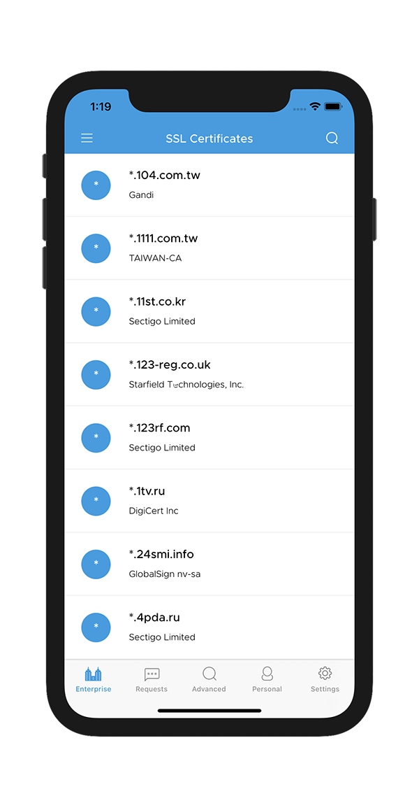 エンタープライズメニューの証明書オプションをタップし、PAM360リポジトリで管理しているすべてのSSL証明書を表示します。リストのSSL証明書をタップし、以下の証明書詳細を表示します:コモンネーム、ポート、有効期間、SAN、発行者、署名アルゴリズム、指紋、シリアル番号、キーアルゴリズム、キーサイズ、発行者。