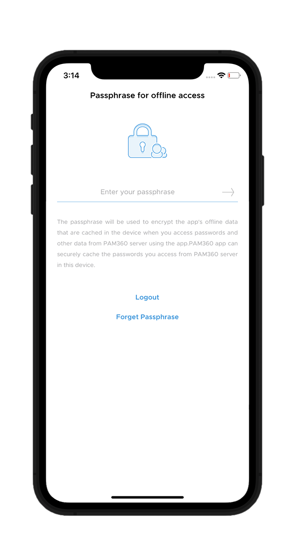 アプリケーションは、セキュリティ強化のため、二要素認証(TFA)を採用しています。有効になると、ユーザーは、2つ連続のステージを通って認証し、モバイルインターフェイスにアクセスする必要があります。第一レベルの認証方法は3つあります:Active Directory/LDAP/Azure AD認証情報を使った、またはSAML SSOを使ったPAM360のネイティブ認証。第二の認証は、PAM360がサポートする二要素認証プロビジョンにより実行できます。二要素認証が完了した後、PAM360は、モバイル認証に使用する、最小8文字で、アカウントにパスフレーズをセットアップするように求めます。すべてのオフラインデータは、高度なAES-256暗号化アルゴリズムを使って暗号化されます。アプリケーションにお使いのパスフレーズが保存されていません。また、ログイン中はパスフレーズの入力は必須ですので、注意してください。