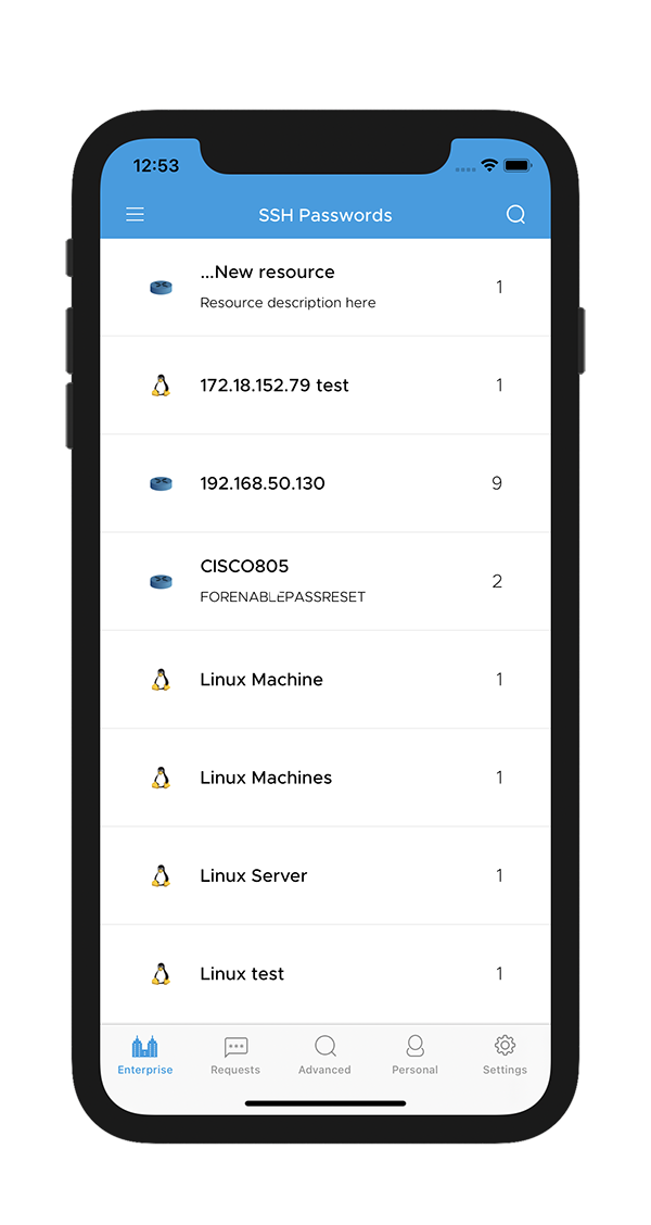 このオプションでは、SSH接続でアクセスできるすべてのリソースの統合ビューが見られます。このリストのリソースをタップして、そのユーザーアカウントを表示します。いずれかのアカウントをタップして、マスキングされたパスワード、最後の修正時刻、最後にアクセスした時刻、およびパスワードの有効期限日等のアカウント詳細を表示します。[検索]アイコンをタップして、検索キーワードを使って、選択したリソース内のアカウントを検索します。