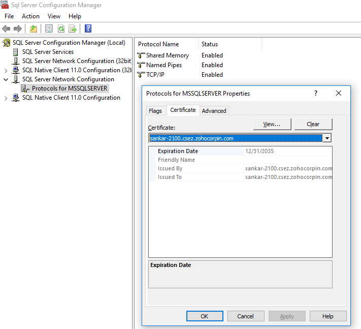 PAM360 を SQL Serverに接続する前に、SQL Server で SSL 暗号化を有効にする必要があります。このためには、SSL 証明書を作成し、認証局 (CA) による署名を取得するか、自己署名を取得する必要があります (詳細を参照)。