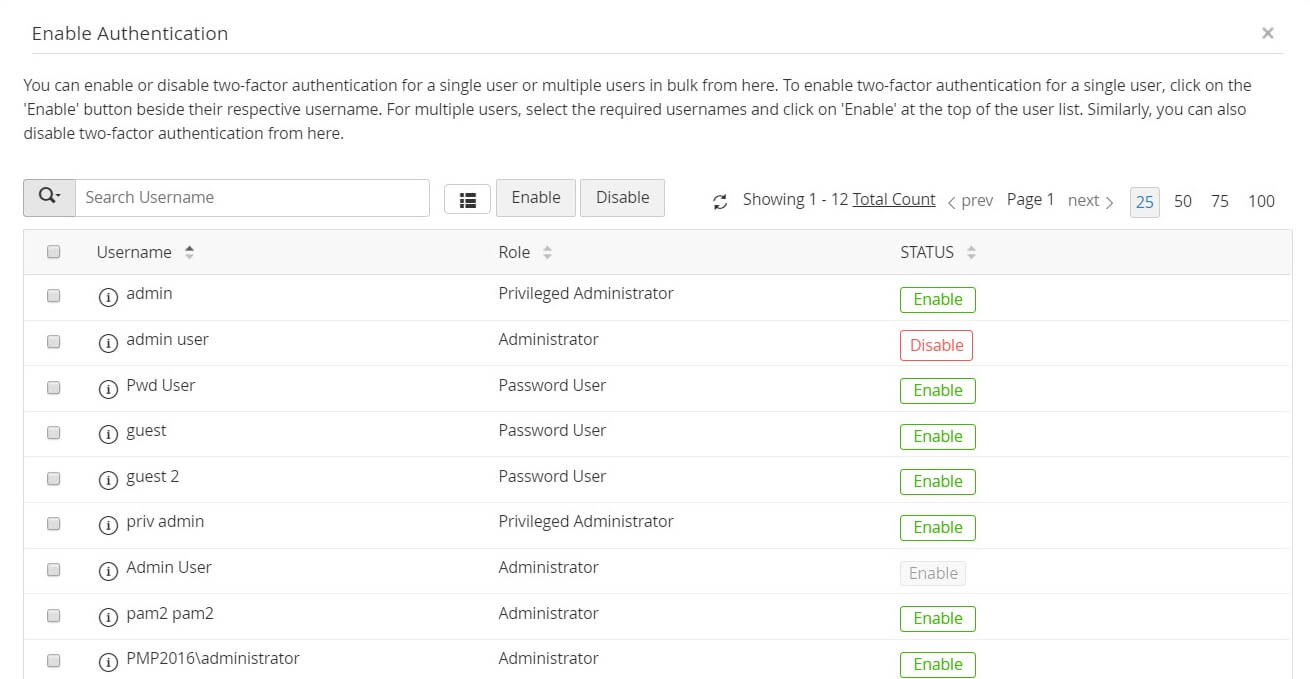 - ここから、単一ユーザーまたは複数のユーザーに対して TFA を一括で有効または無効にできます。単一ユーザーにTFAを有効にするには、各ユーザー名の横の[有効化]ボタンをクリックします。複数ユーザーの場合は、必要なユーザー名を選択し、ユーザーリスト上部の[有効化]をクリックします。同様に、ここからTFAを無効化することもできます。
