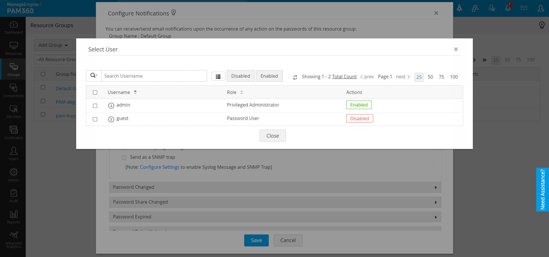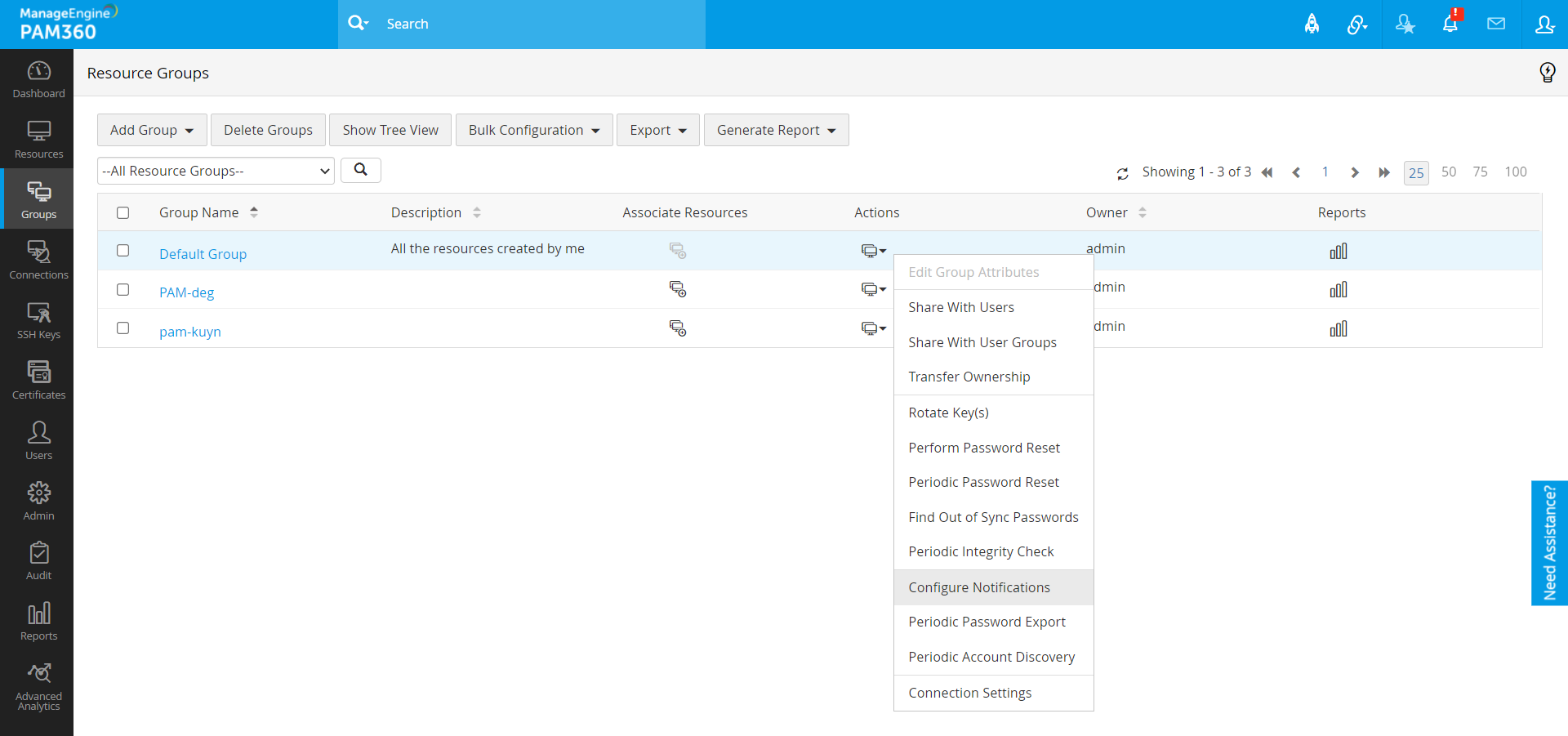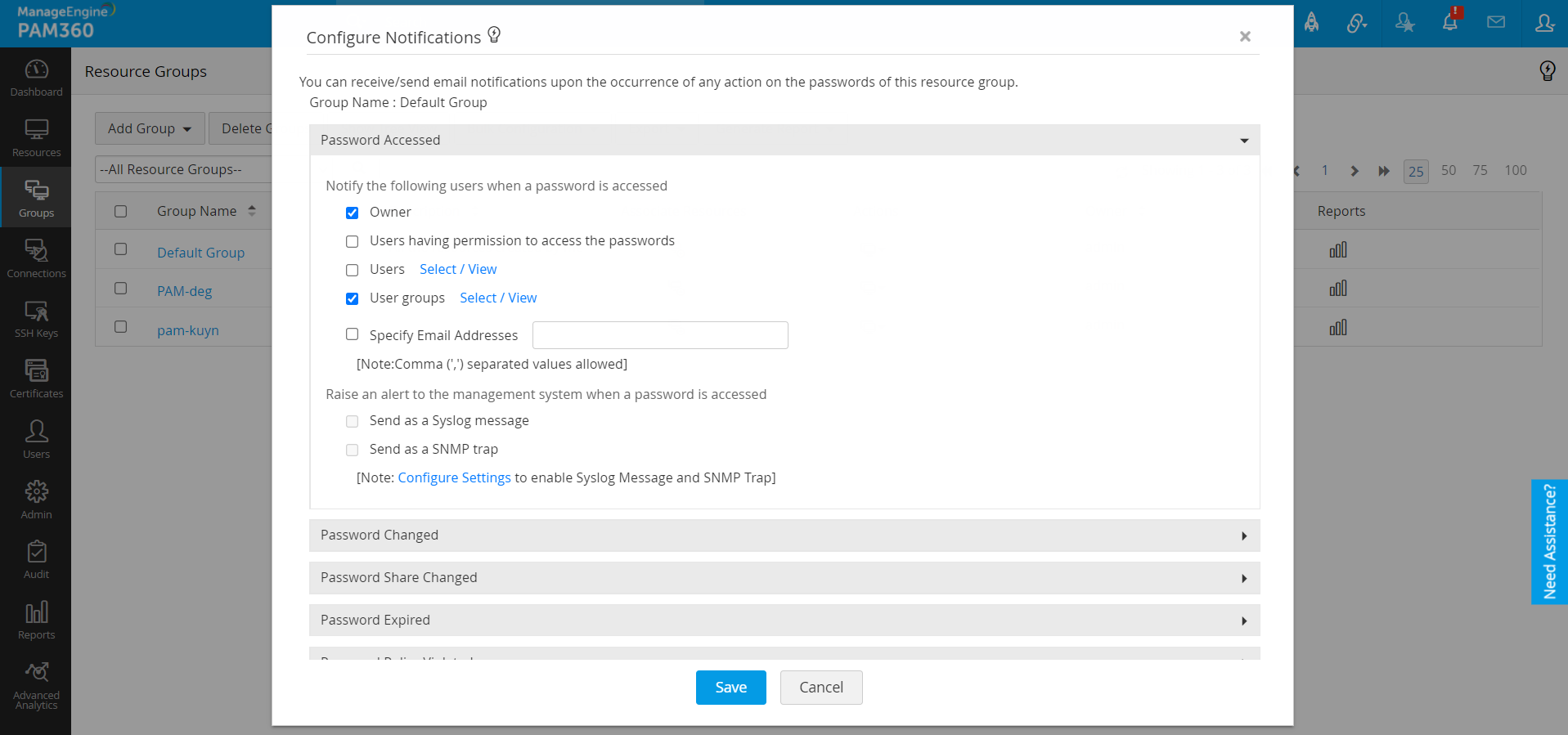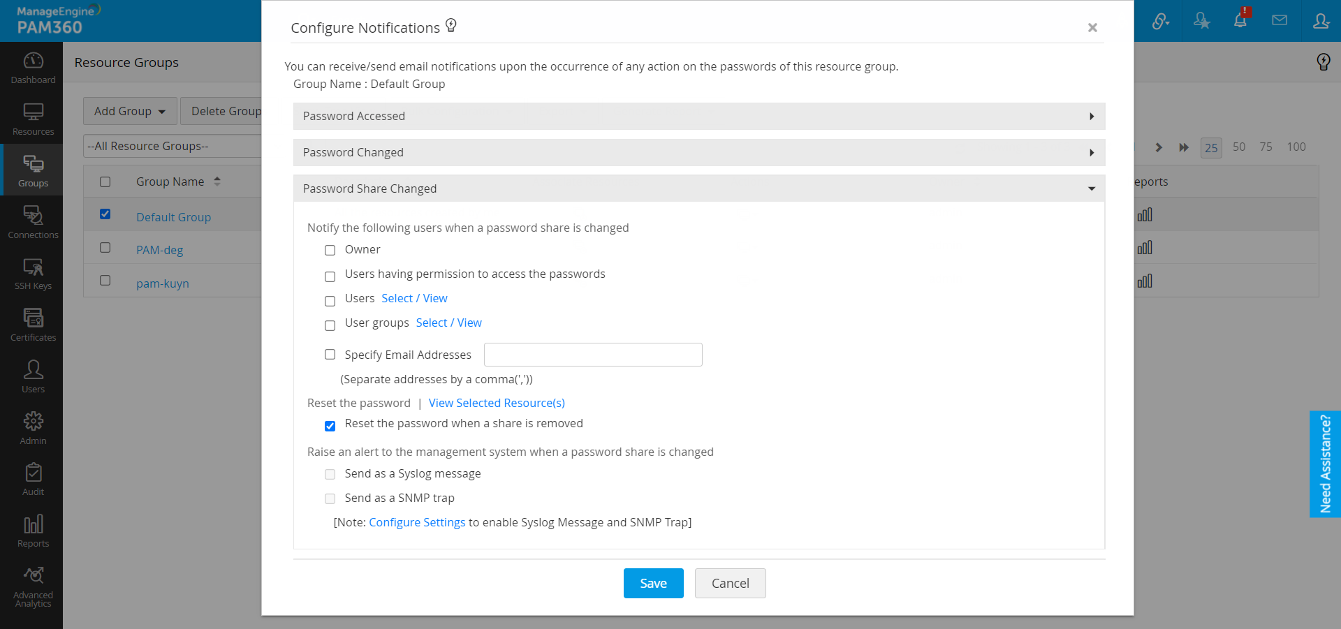 通知に加え、特にパスワード共有が変更される、またはパスワードの有効期限が切れるとき、パスワードリセット操作をPAM360が自動的に実行するように構成することもできます。パスワード アクション通知は、リソース グループ レベルでのみ構成できます。
