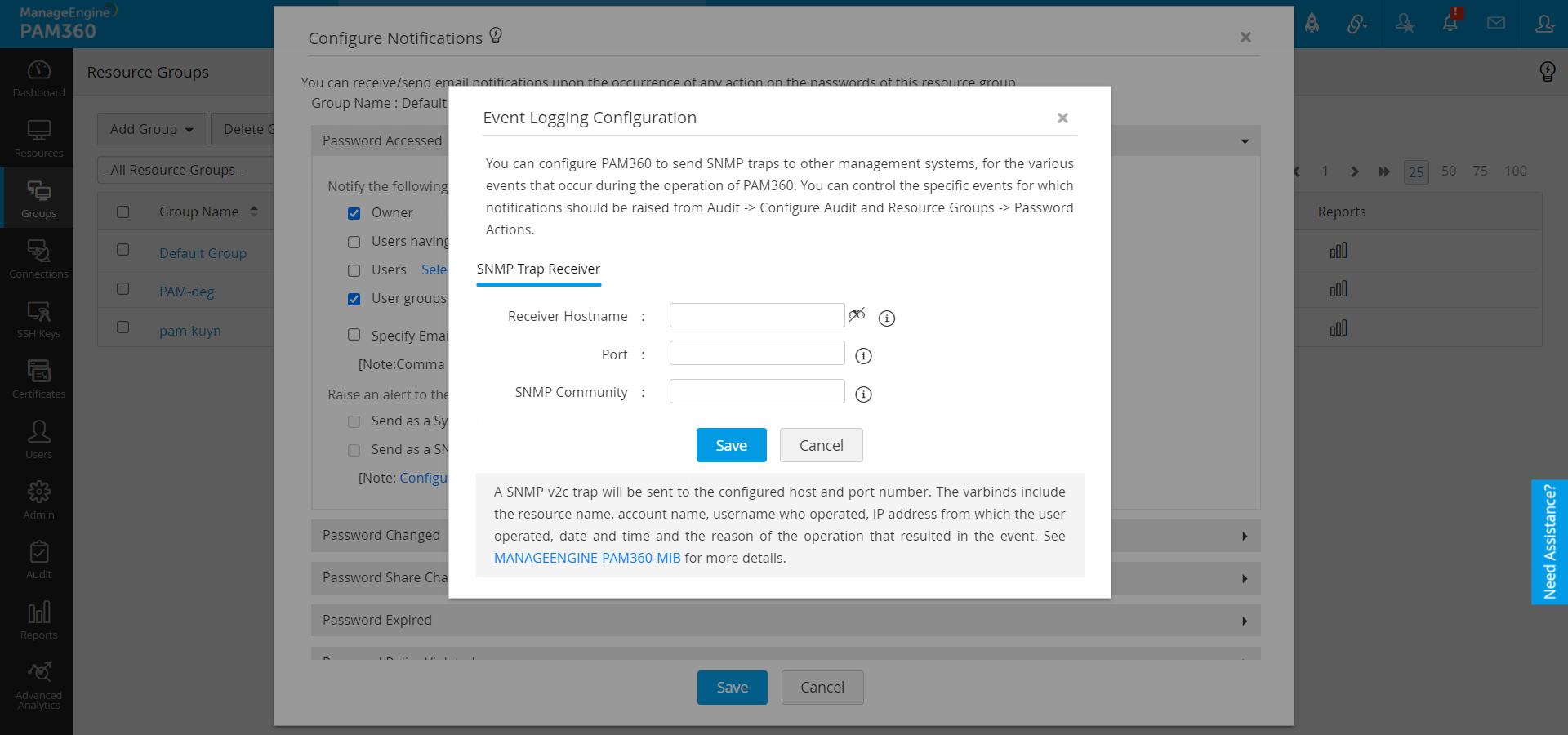- 上記以外、SNMPトラップをネットワーク管理システム生成できます。[パスワード操作を構成]ウインドウでこれらのオプションを選択する前に、[管理者] >> [SNMPトラップ]で、これらの設定をグローバル構成していることを確認します。こちらの関連ヘルプドキュメントを参照してください。