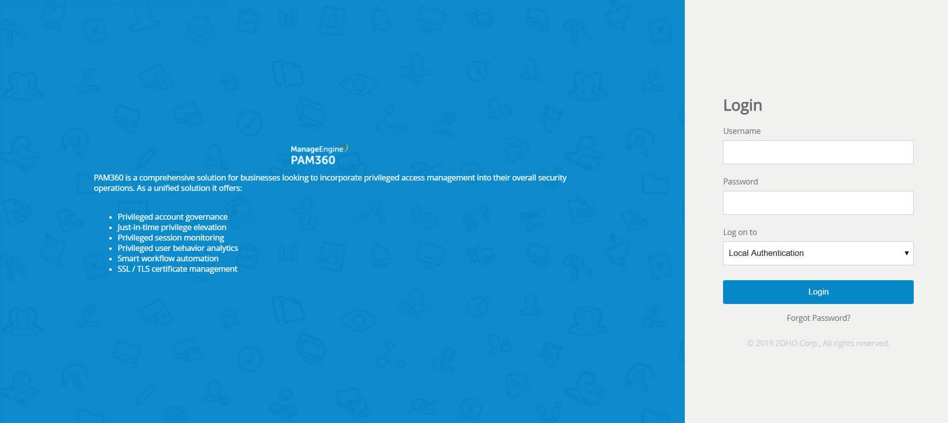 - PAM360 Webインターフェイスを起動すると、ユーザーは、ユーザー名を入力し、PAM360にログインして、[ログイン]をクリックする必要があります。