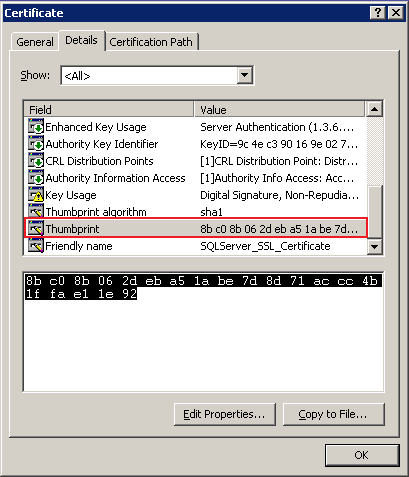 - このサムプリントを次の場所に保存します:HKEY_LOCAL_MACHINE\SOFTWARE\Microsoft\Microsoft SQL Server\MSSQL.x\MSSQLServer\Certificate property。