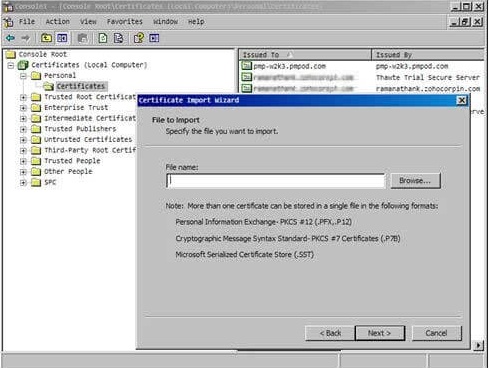 - インストールするエクスポートされた .pfx ファイル証明書を参照して選択します。