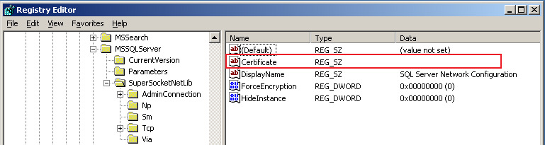 HKEY_LOCAL_MACHINE\SOFTWARE\Microsoft\Microsoft SQL Server\MSSQL.x\MSSQLServer\SuperSocketNetLib\Certificate
