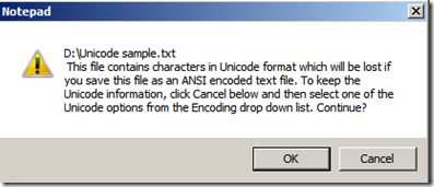 - メモ帳の内容を ANSI 形式の別のファイルとして保存すると、次のダイアログが表示されます。[OK] をクリックして続行します。