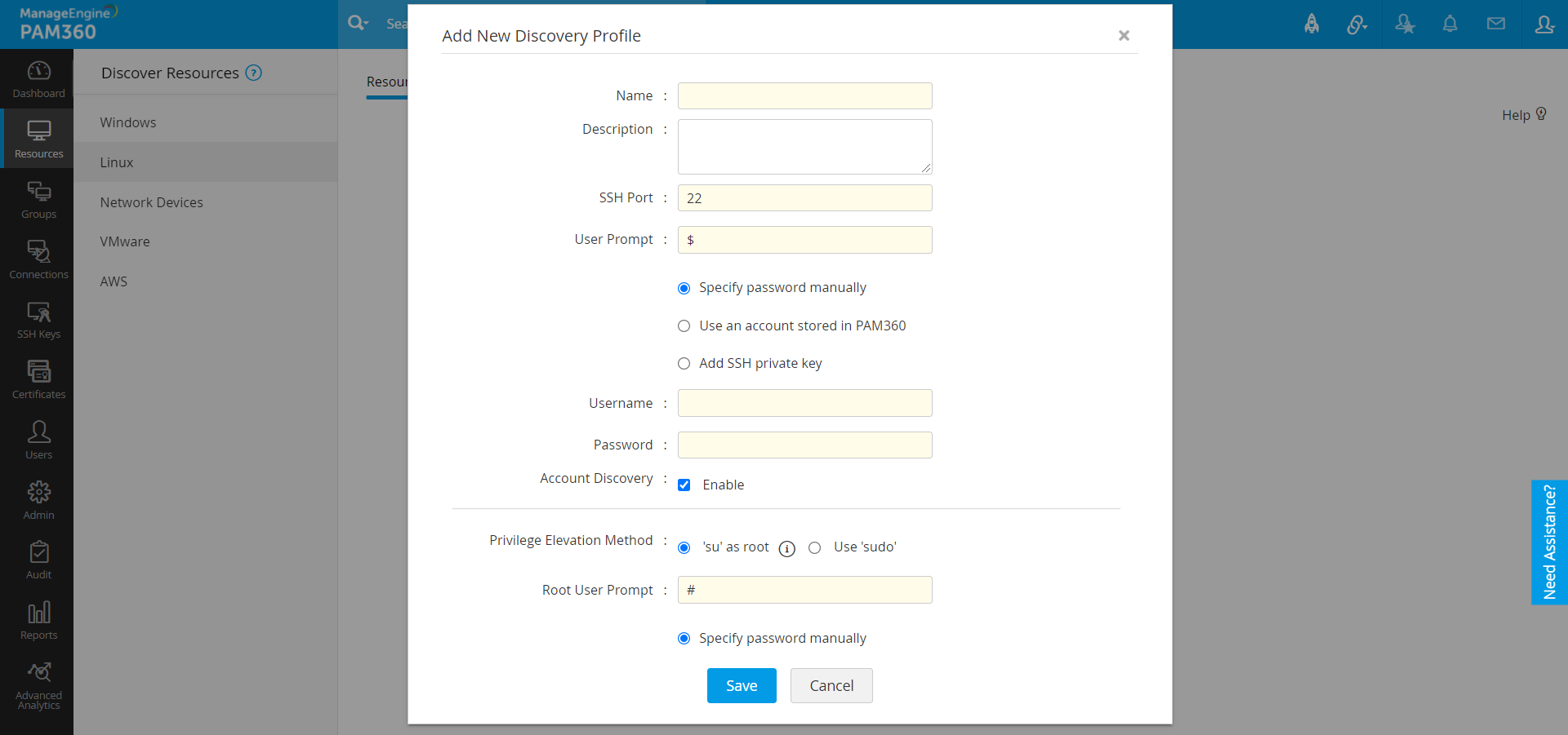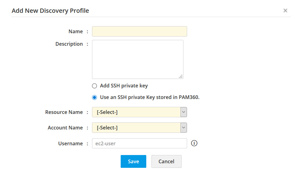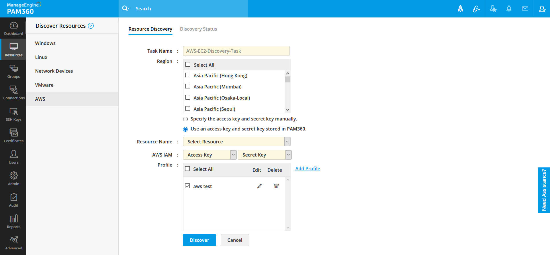 - PAM360に保存されているアカウントを使用: このオプションを選択した場合は、それぞれのドロップダウンからリソース名とアカウント名を選択する必要があります。
