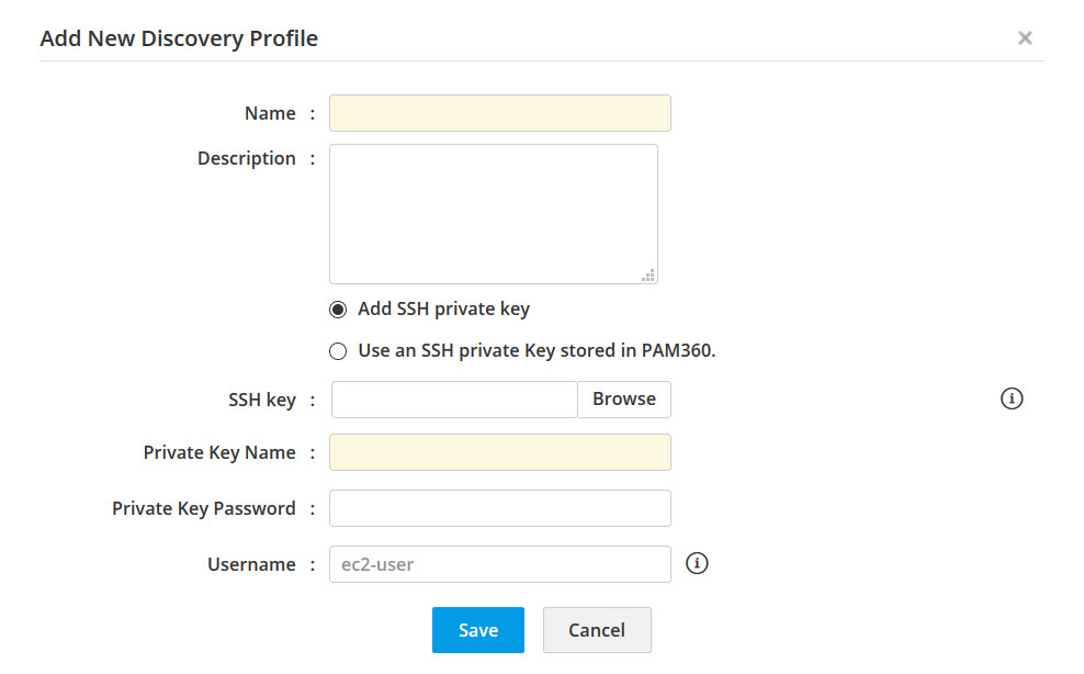 - SSH 秘密鍵を追加:このオプションを選択した場合は、ユーザー名、秘密鍵名、秘密鍵のパスワードなどの詳細を入力する必要があります。有効な SSH キー ファイルを選択します。