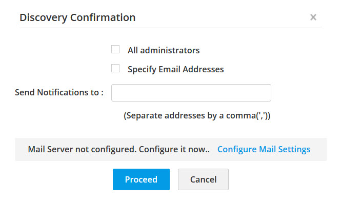 - [検出]をクリックします。検出確認ウィンドウがポップアップ表示されます。通知を[すべての管理者]に送信するか、特定の人に送信するかを選択します。後者のオプションを選択する場合は、Eメール アドレスをコンマで区切って指定します。[続行]をクリックします。[検出ステータス] ページが表示され、検出されたデバイスがタスクとして追加されます。ディスカバリが呼び出された日時、完了した日時など、その他の詳細も表示されます。