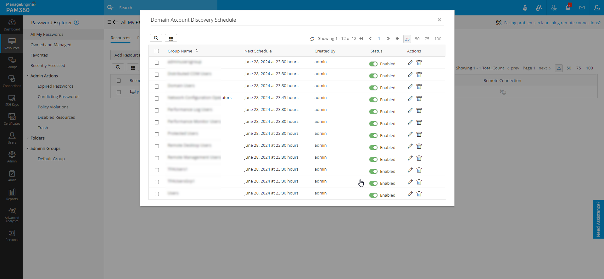 - PAM360 は、リソースの同期を維持するために定期的に AD にクエリを実行できます。AD に追加された新しいドメイン アカウントは、リソース データベースの同期を維持するために、PAM360