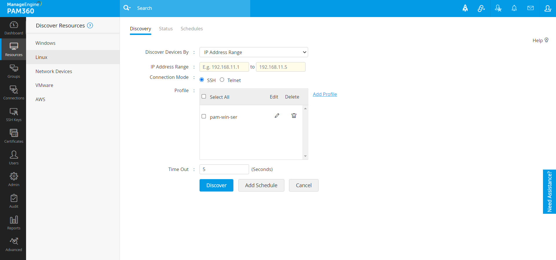 メモ:検出するデバイスが、PAM360 が実行されているホストとは別のサブネットにある場合、検出には、接続時間が延長されるため、指定した実際のタイムアウトより長くなる可能性があります。Telnet オプションは間もなく無効になり、専用のリモート接続モードは[SSH]のみになります。