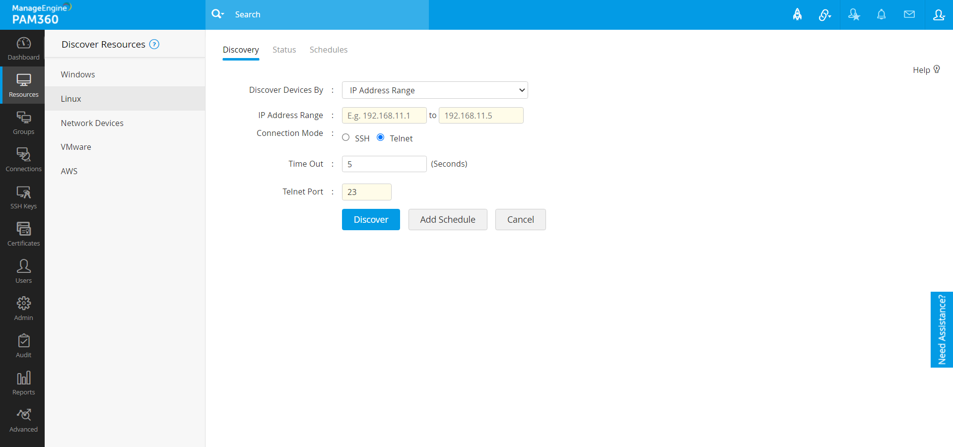 PAM360は、TelnetとSSHをリモート接続モードとして使用し、Telnet/SSHが実行されているデバイスを検出します。