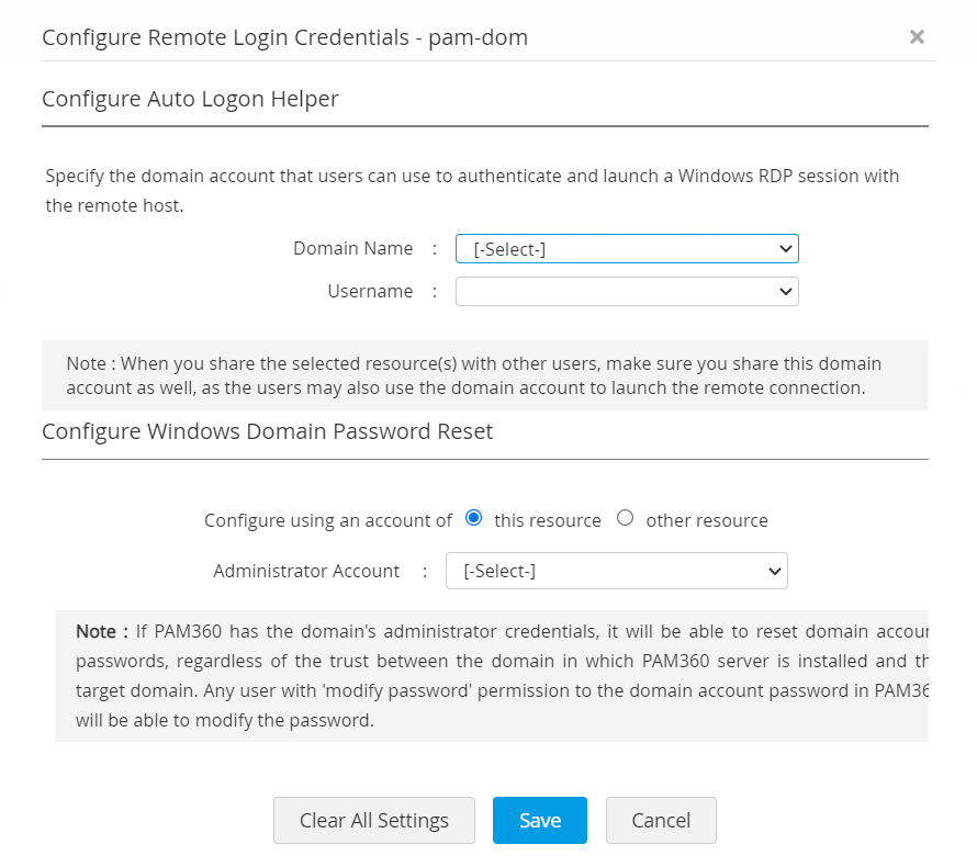 - 初めに、PAM360は、Windows Domainリソースをドメイン名で作成します。例えば、ドメイン名がPAM360の場合、作成されるリソース名は、PAM360 - .ドメインコントローラーになります。
