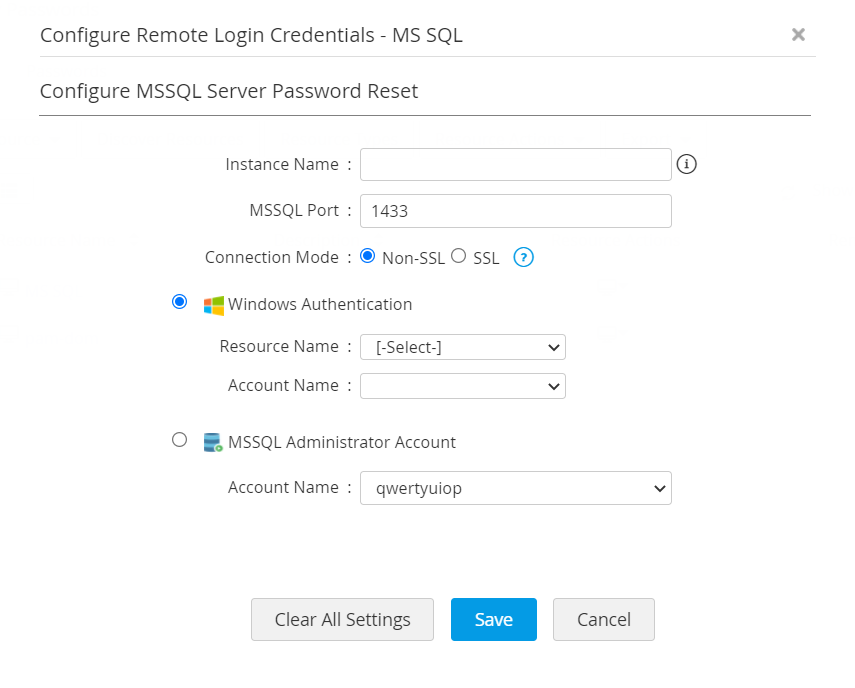 - MSSQL サーバーの場合、デフォルトのポートは 1433 です。[アカウント名] ドロップダウン リストから管理者アカウントを選択し、設定を保存します。