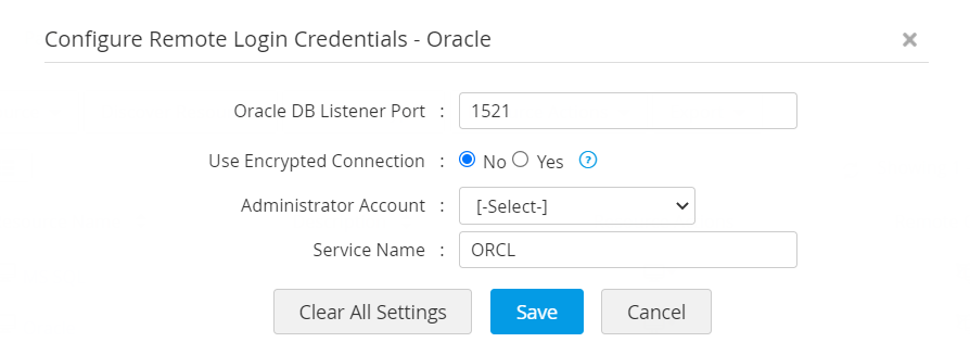 - Oracle DB サーバーの場合、デフォルトのポートは 1521 です。ドロップダウンリストから管理者アカウントを選択し、設定を保存します