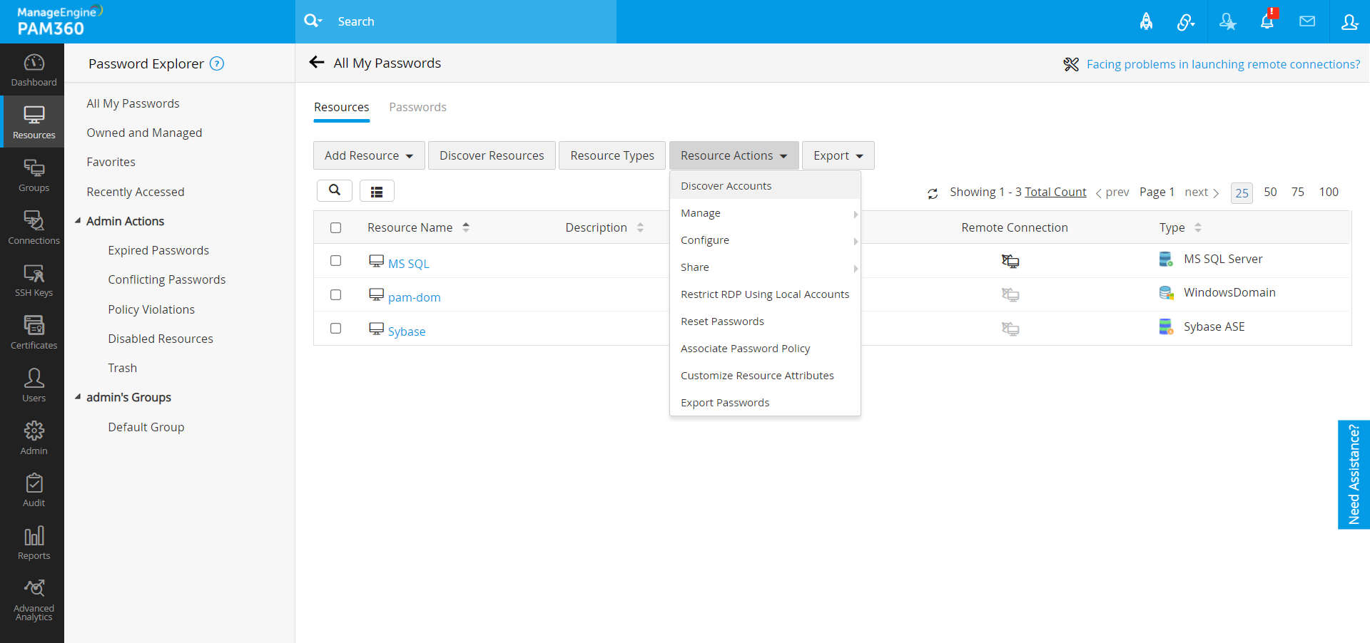- このリソースのリモート パスワード リセットを構成するには、リソースの横にある [リソース アクション] ドロップダウン メニューをクリックし、[リモート パスワード リセットの構成] を選択します。