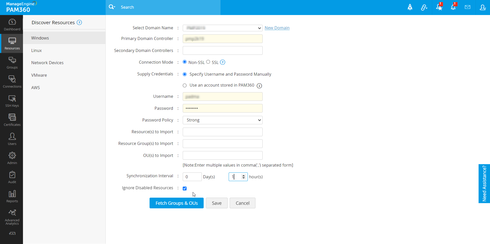PAM360は、PAM360が実行されているWindows DomainコントローラーからすべてのWindows Domainを自動検出し、一覧表示します。必要なのは、必要なドメインを選択し、ドメイン コントローラーの認証情報を提供することだけです。