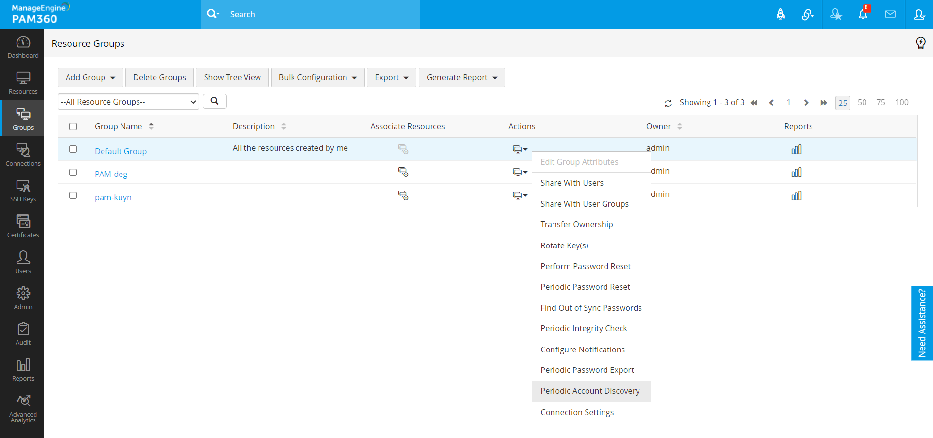 - [リソース グループ] タブで、[アクション] ドロップダウンから [定期的なアカウントの検出] を選択します。これを使用すると、スケジュール設定されたタスクを作成して、リソース グループに属するリソースの一部であるアカウントを定期的に検出できます。