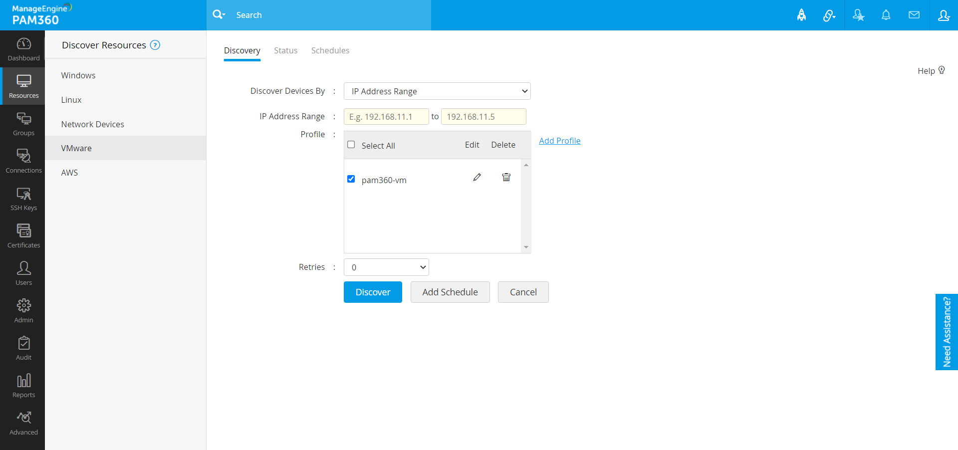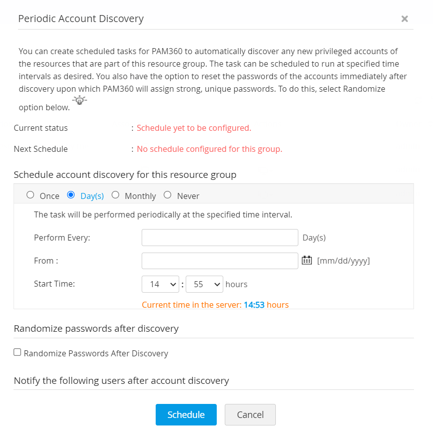 - 定期的なリソース検出をスケジュール設定する場合は、[スケジュールを追加]をクリックします。新しいウィンドウが表示され、リソース検出中に新しく追加されたアカウントを検出するための自動スケジュールされたタスクを作成できます。詳細は、ここをクリックしてください。