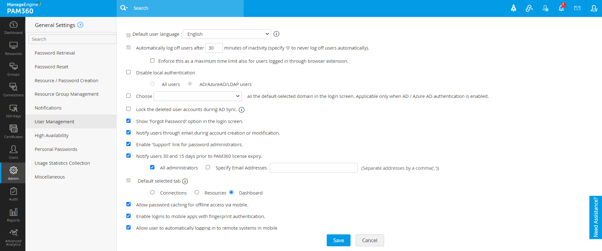 - PAM360は、定期的にADを照会し、リソースを同期した状態にします。新しいリソースがADに追加されると必ず、それらのユーザーをPAM360に自動追加し、リソースデータベースの同期を維持するプロビジョンがあります。所定リストから同期間隔を設定し、PAM360がADを照会してリソースデータベースの動機した状態にする時間間隔を決定できます。この時間間隔は、最短で 1 分から数時間または数日までの範囲になります。時間間隔を設定したら、[保存]をクリックします。