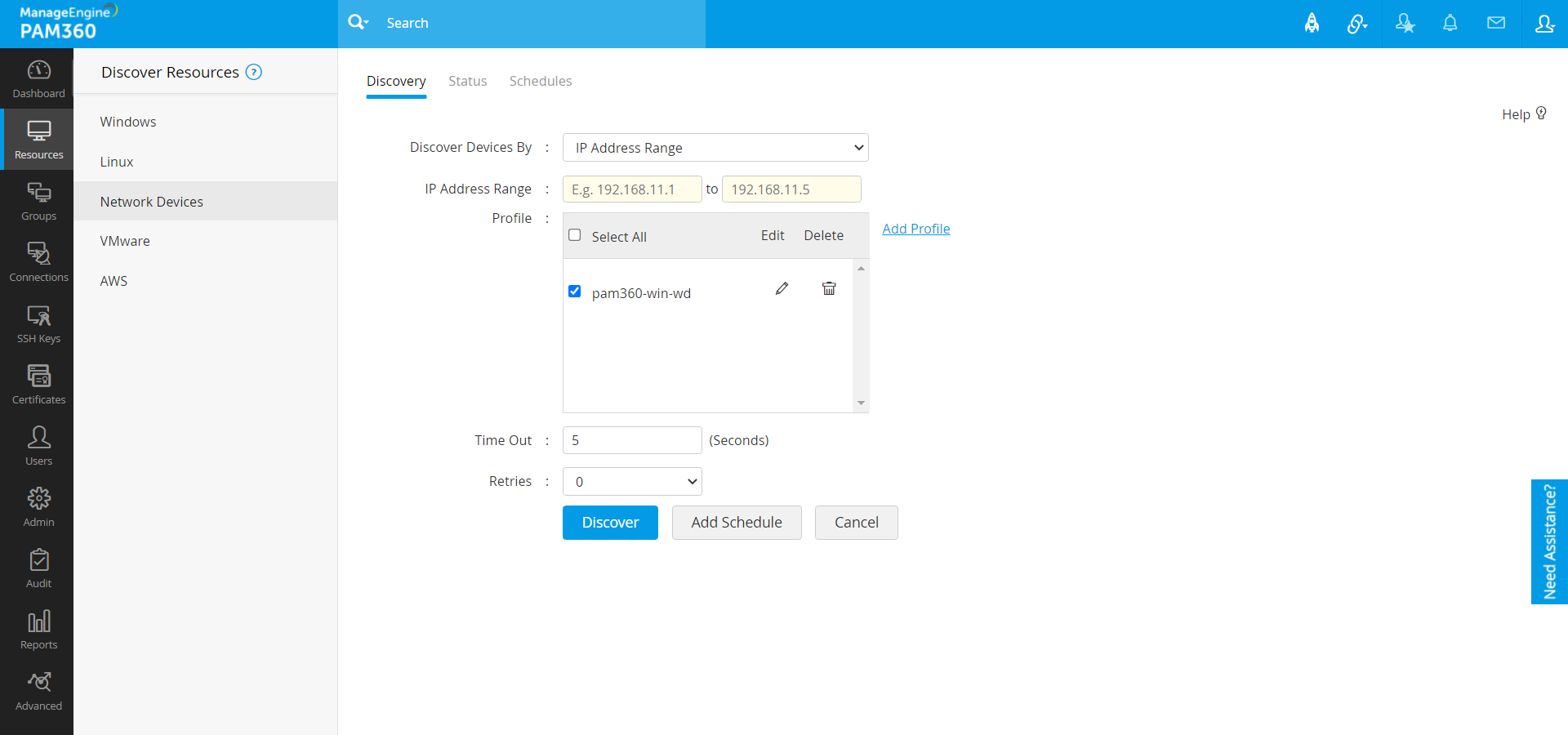 注記:検出するデバイスが、PAM360 が実行されているホストとは別のサブネットにある場合、検出には、接続時間が延長されるため、指定した実際のタイムアウトより長くなる可能性があります。