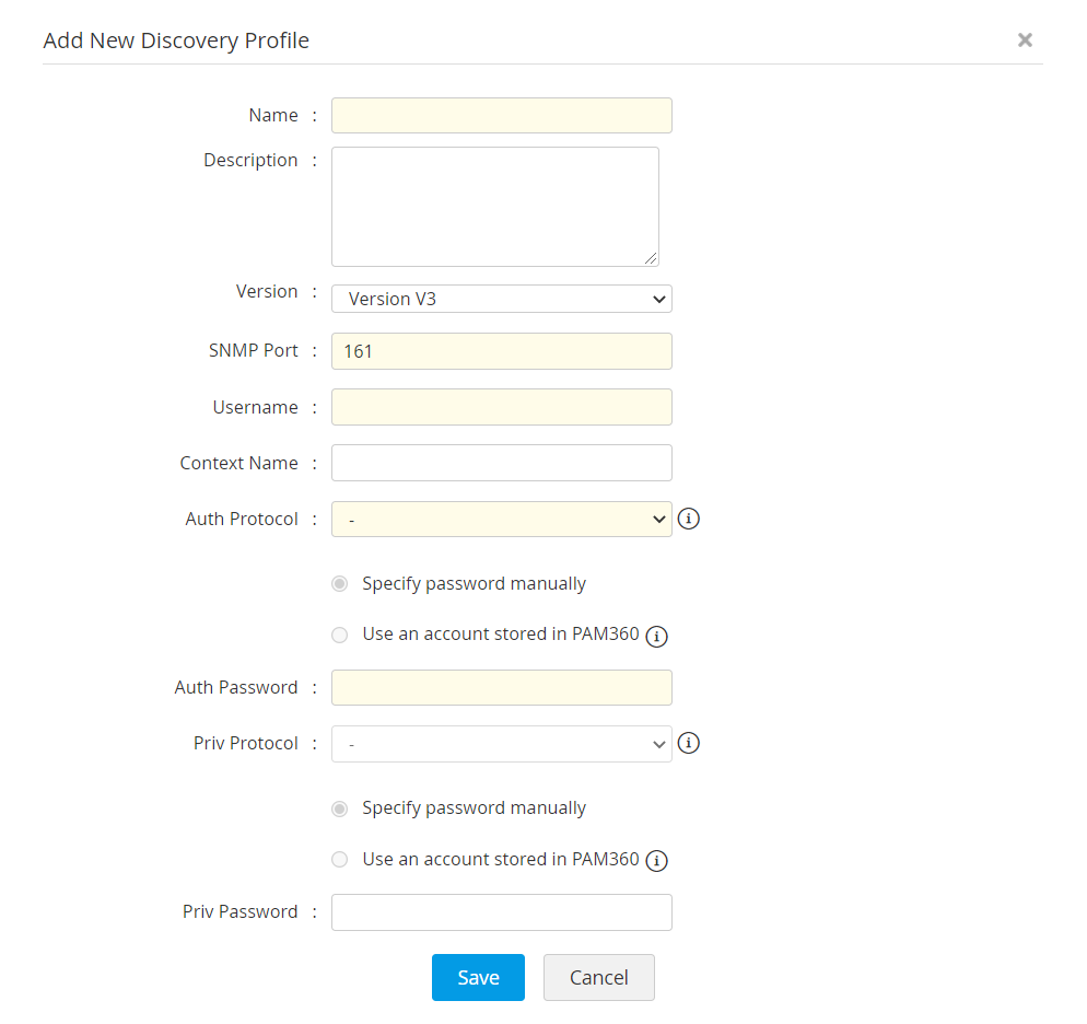 ネットワークデバイスの検出に進む前に、PAM360が複数のデバイスを検出するための共通する詳細事項を使うことができるように、検出プロファイルを作成する必要があります。