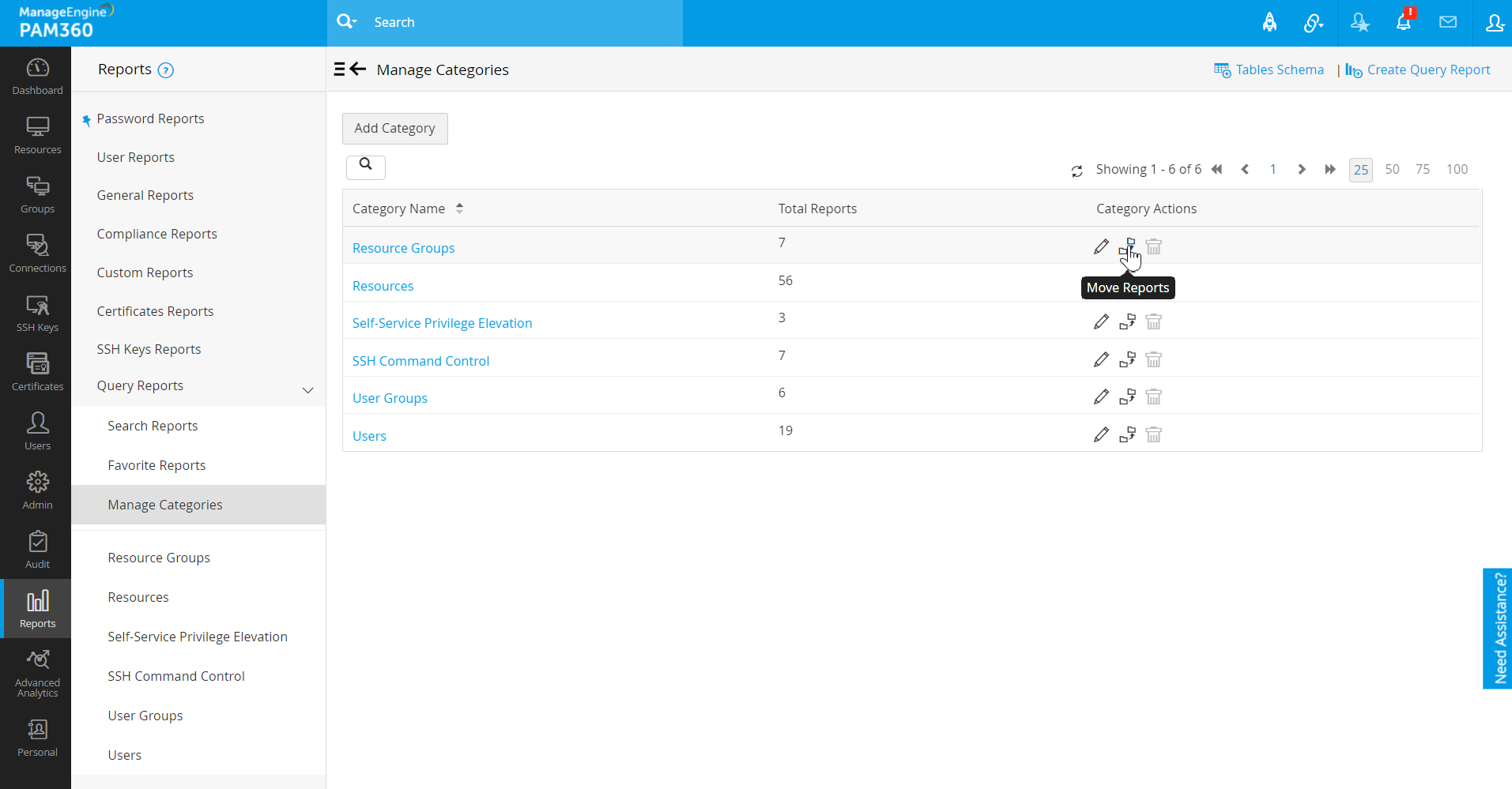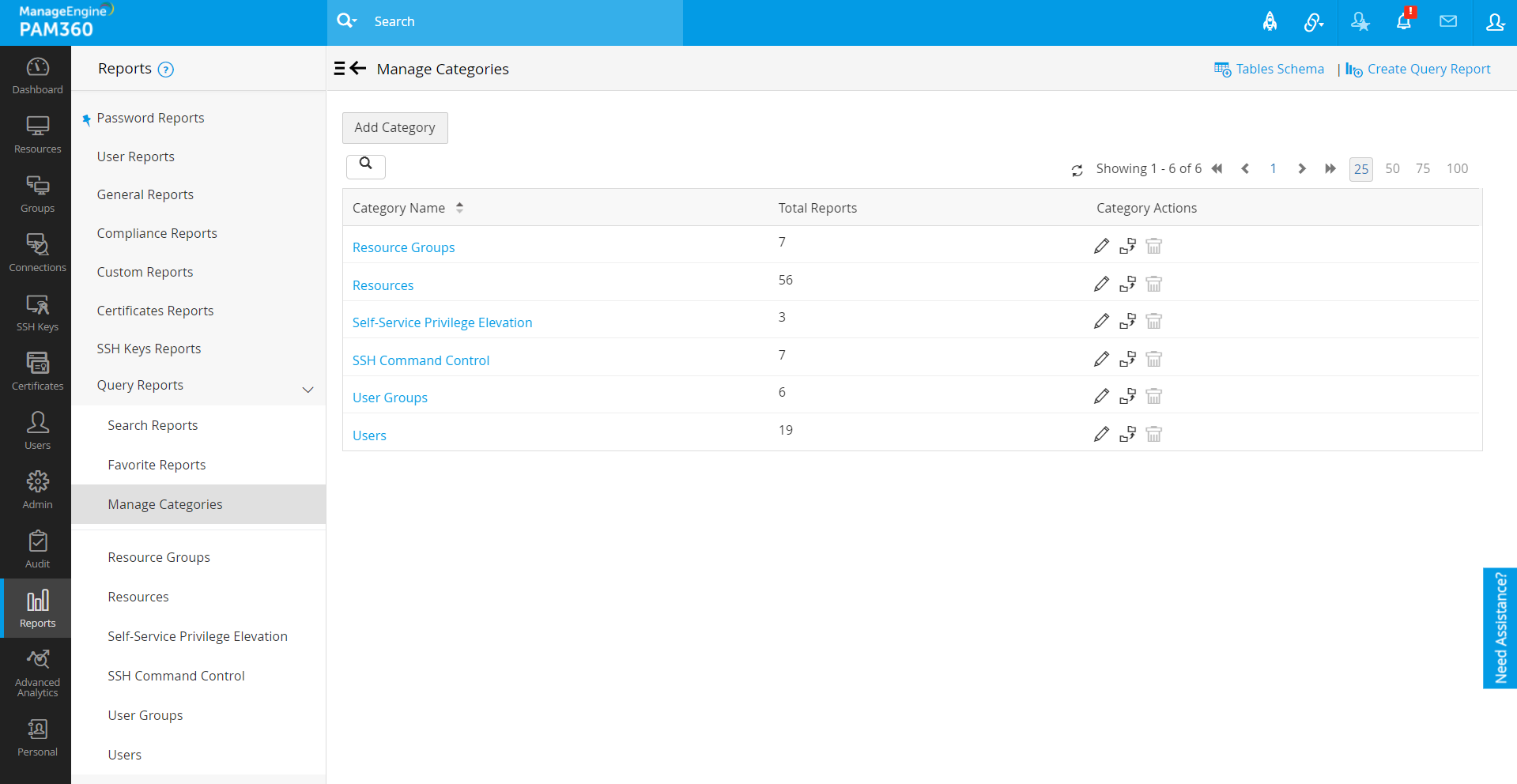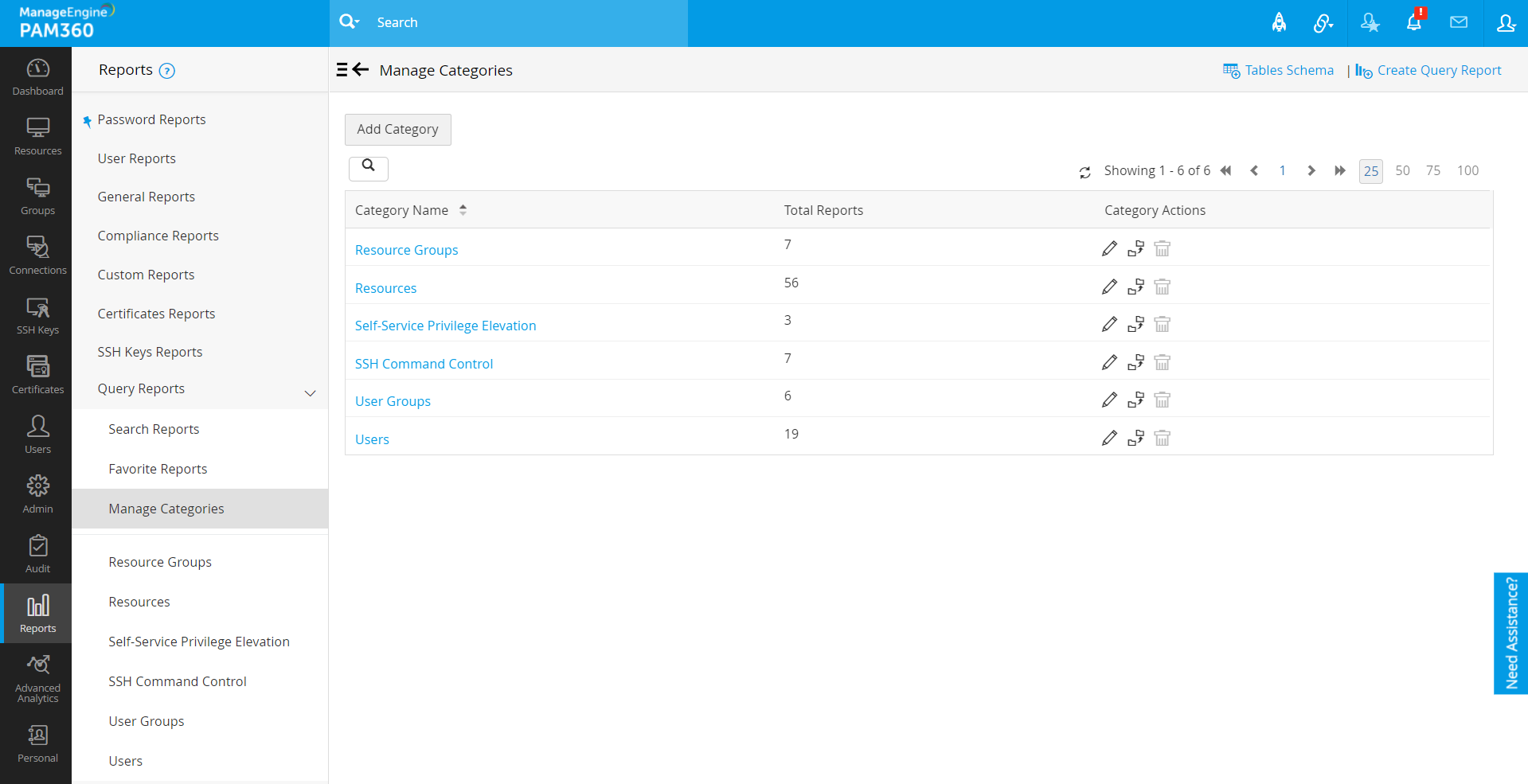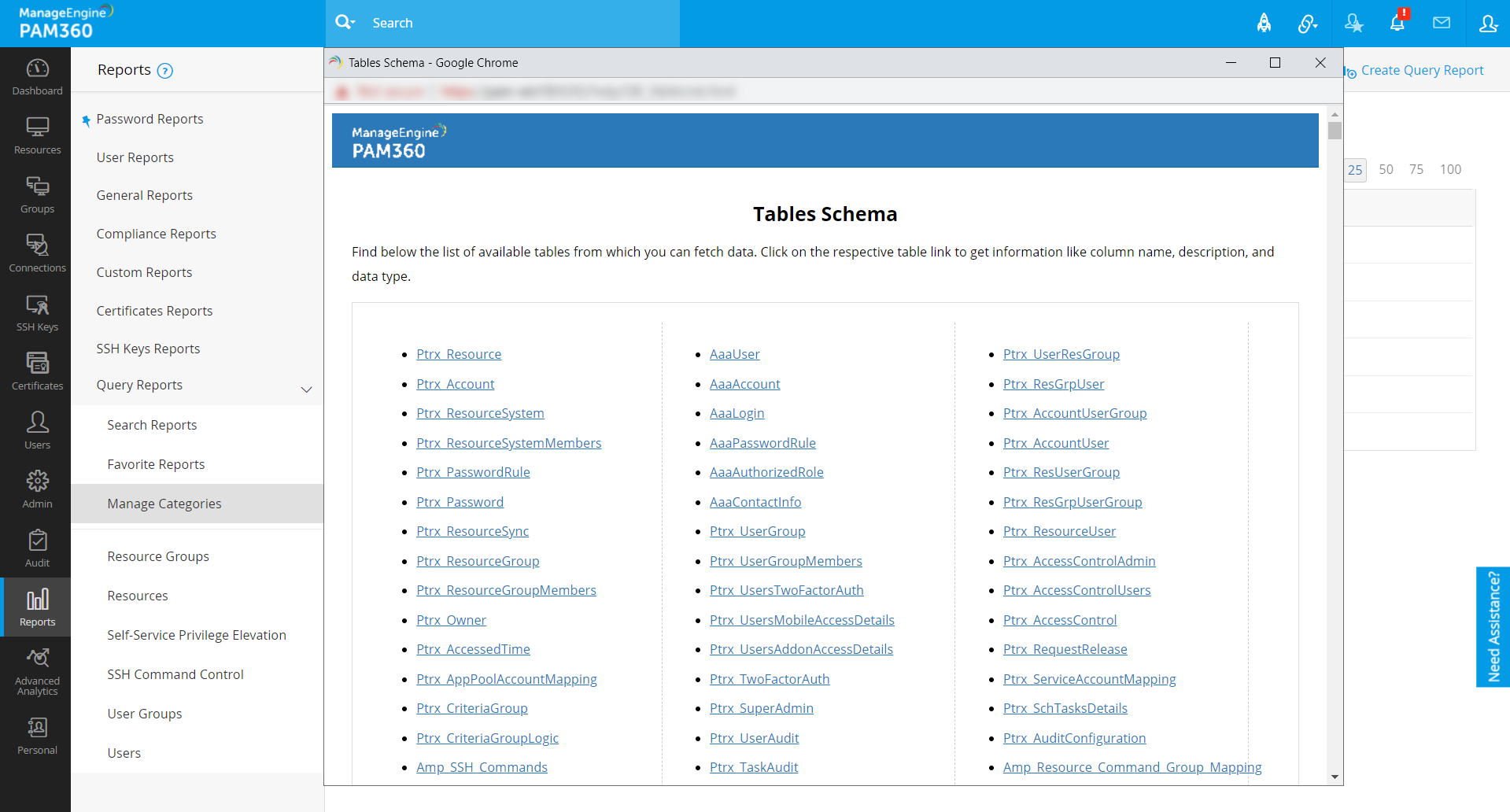 PAM360では、デフォルトクエリを使うか、製品GUIに表示のターブルスキーマを参照してSQLクエリを作成して、クエリレポートを2つの方法で実行できます。デフォルトクエリレポートは事前定義したカテゴリ - リソースグループ、リソース、ユーザーグループ、およびユーザーにあります。