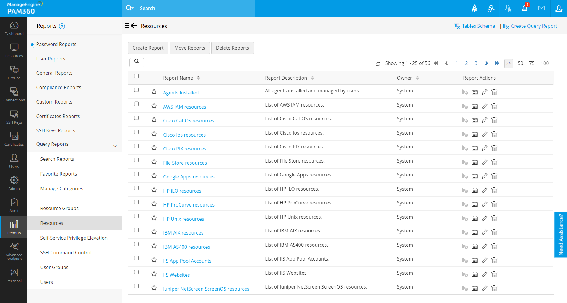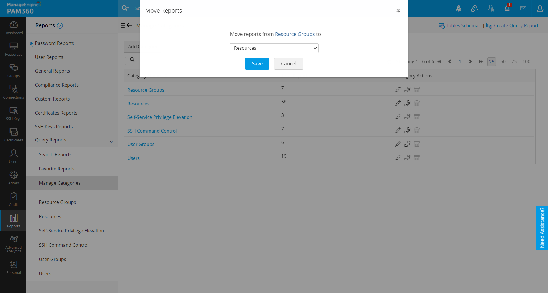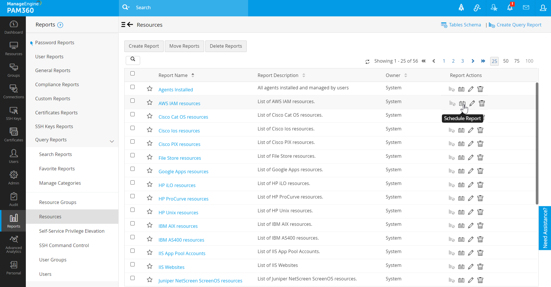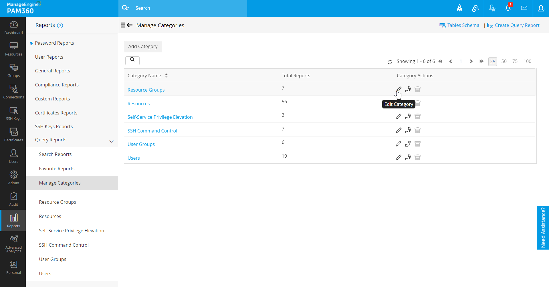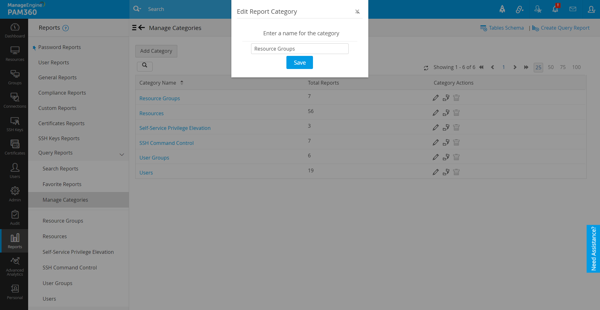 PAM360では、デフォルトクエリを使うか、製品GUIに表示のターブルスキーマを参照してSQLクエリを作成して、クエリレポートを2つの方法で実行できます。デフォルトクエリレポートは事前定義したカテゴリ - リソースグループ、リソース、ユーザーグループ、およびユーザーにあります。