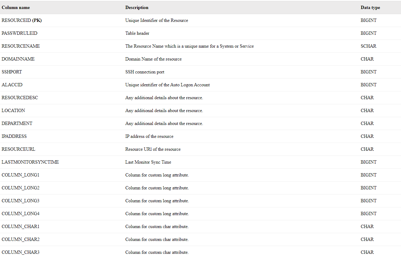 表示されるダイアログ ボックスで、各テーブルの列名、説明、データ型を表示するリストまで下にスクロールします。データタイプの下で、SCHAR を探します。SCHAR のデータタイプのコラムは暗号化されます。
