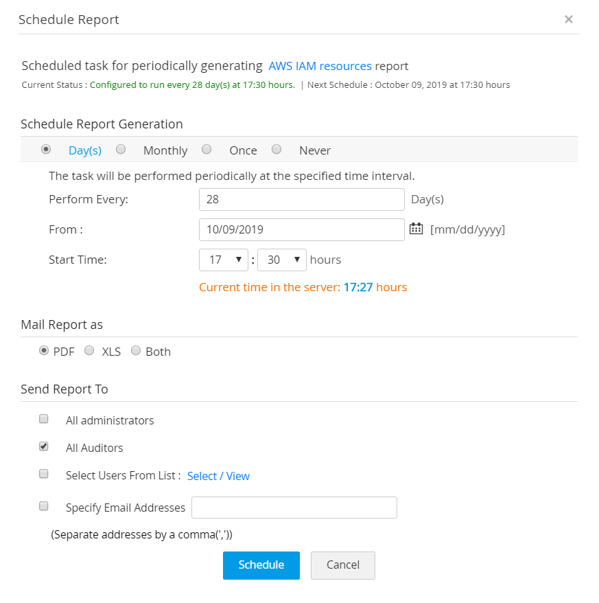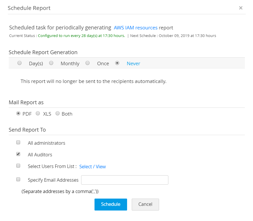 - レポートの送信先となる受信者を指定されたオプションから選択します。代わりに電子メール ID のカスタム リストを提供することもできます。