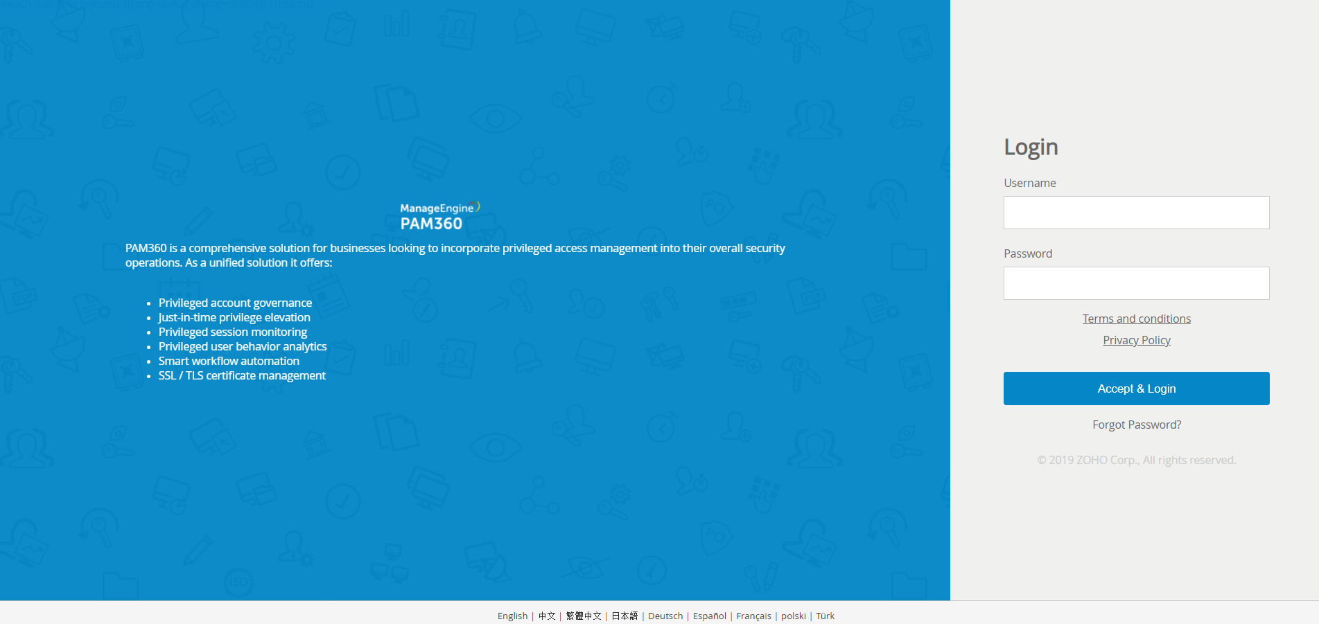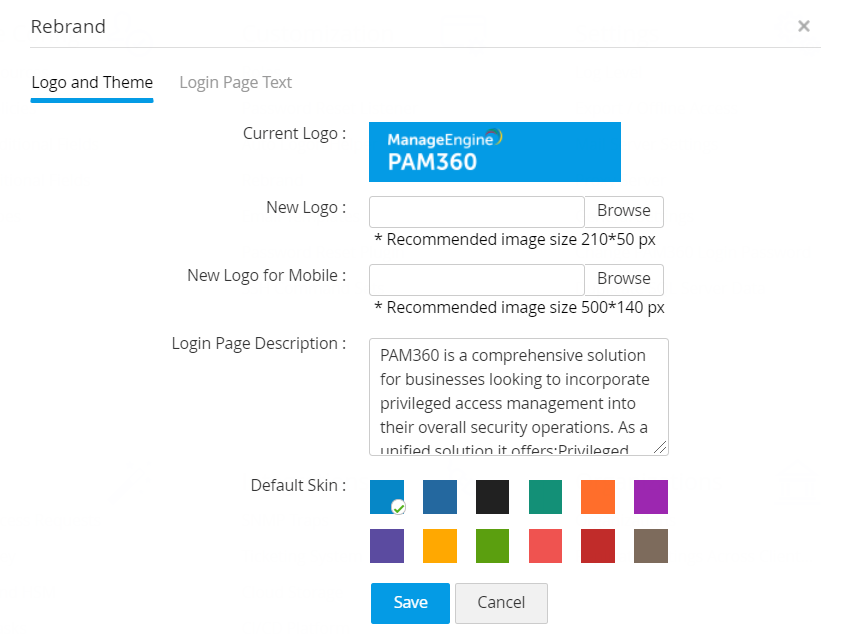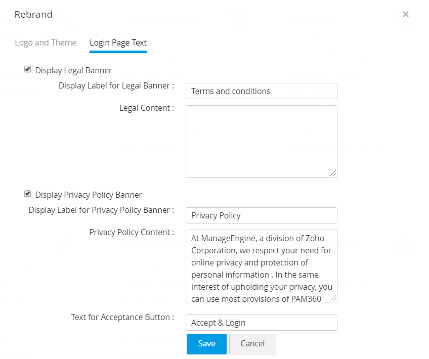 ログイン画面とWebインターフェイスに表示されるPAM360ロゴのお手持ちのものとの置き換えは、Webインターフェイス自体から実行できます。ロゴのサイズは 210*50 ピクセルであることが望ましいです。PAM360には、ポリシーおよび/または条件をログインページで追加するオプションがあります。法的通知および/またはプライバシーポリシーをPAM360にログインする前にユーザーに承認してもらう場合は、このオプションを構成および有効化できます。この構成はいつでも無効にできます。