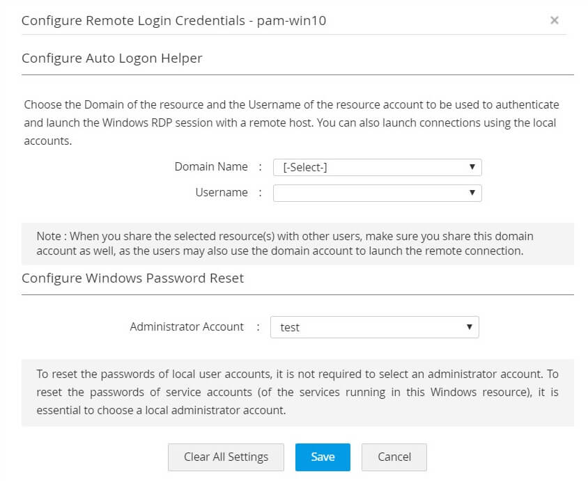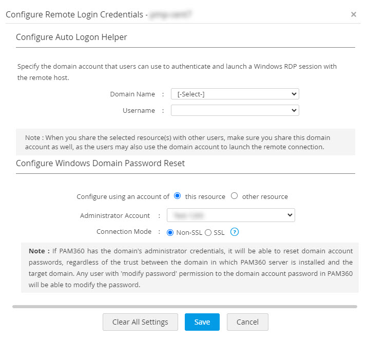 Windows ドメイン リソースに存在するドメイン アカウントのパスワードをリセットするには、リモート ログインとパスワードのリセットに使用する管理者アカウントを指定します。リモートパスワードリセットを設定するには、以下の手順に従ってください。