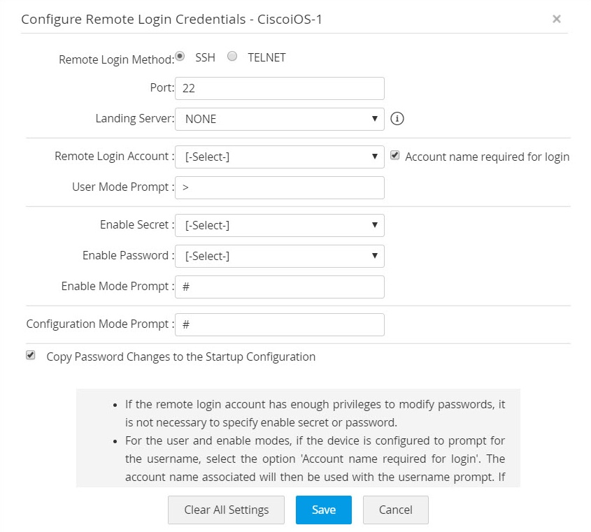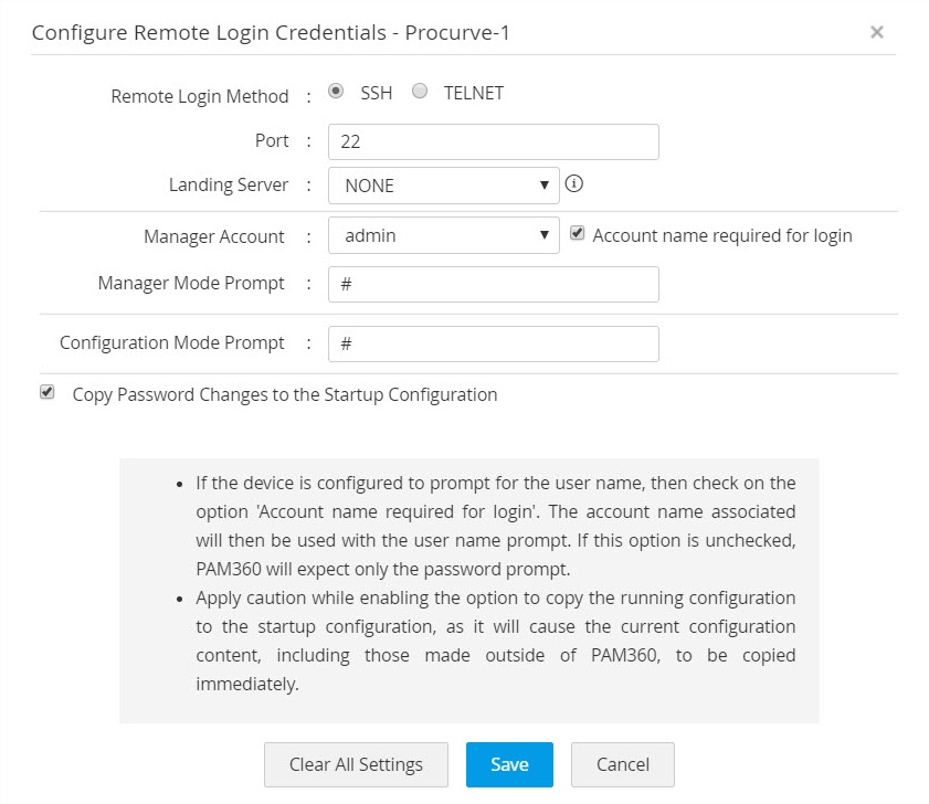 - マネージャーアカウント:デバイスとの接続を確立するためのログインアカウント。デバイスがユーザー名の入力を求めるように設定されている場合は、[ログインに必要なアカウント名]オプションを選択します。対応するアカウント名がユーザー名プロンプトで使用されます。このオプションにチェックが入っていない場合、PAM360はパスワードプロンプトのみ期待します。