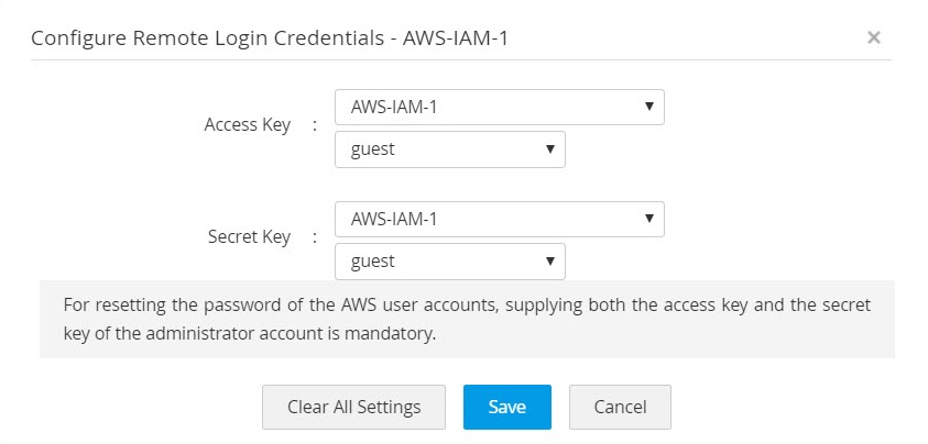 - [リソース]タブ >> [リソース操作] >> [リモートパスワードリセットを構成]の順に移動します。管理者アカウントのアクセスキーと秘密鍵が必要です。