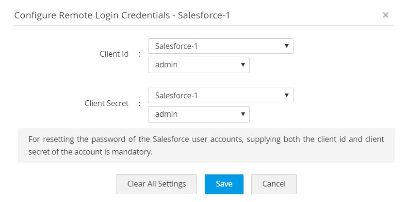- 構成に進むには、[リソース] >> [リソース操作] >> [リモートパスワードリセットを構成].の順に移動します。管理者アカウントのクライアント ID とクライアント シークレットが必要です。
