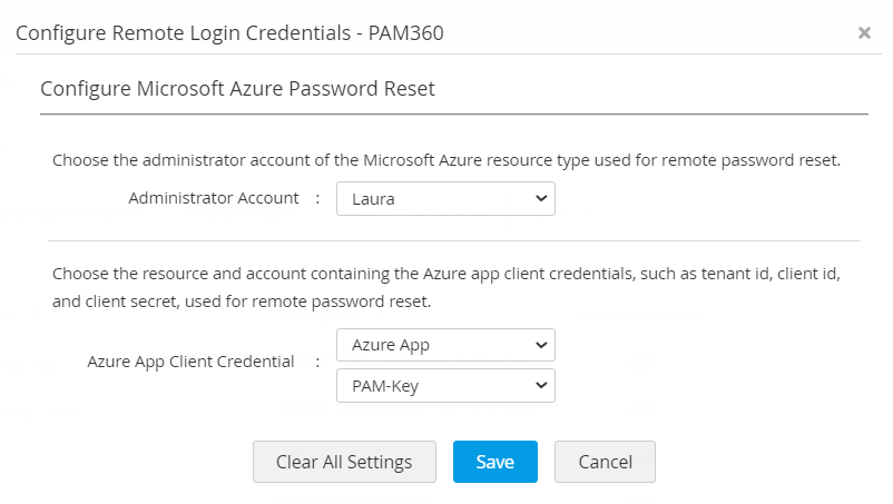 上の前提条件の実行後、以下の手順にしたがって、Microsoft AzureリソースにリモートパスワードリセットをPAM360インターフェイスから実行します: