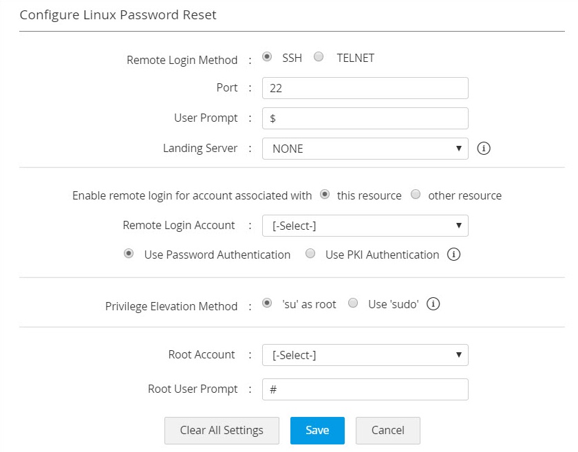 Unixリソースのリモートパスワードリセットの場合、PAM360は初めに、リモートログインアカウントを使って、ターゲットシステムにログインします。次に、パスワードのリセットを実行するには、権限の昇格が必要です。ターゲットシステムがSudoからパスワードリセットコマンドの実行をサポートしている場合、PAM360は、ここで利用可能な2つのオプションのいずれかを使用できます:Root として[su]を実行するか、[sudo]を使用してリモート パスワード リセット コマンドを実行します。