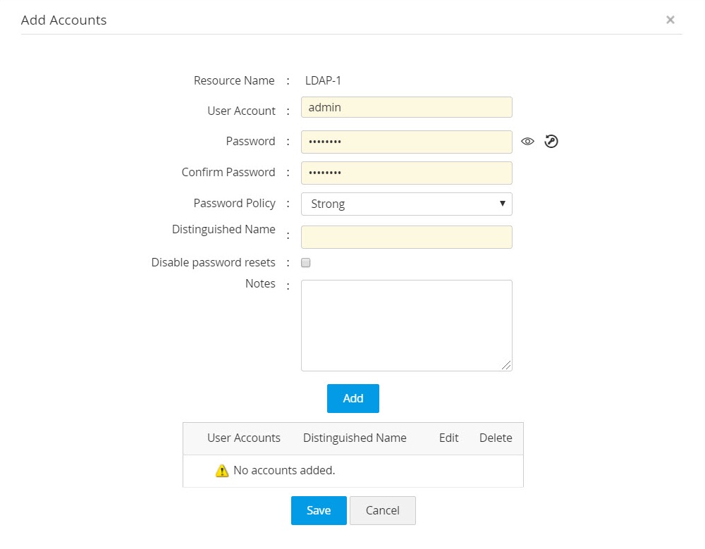 新しいLDAPリソースをPAM360に追加するとき、LDAP Serverアカウントに,識別名を指定する必要があります。