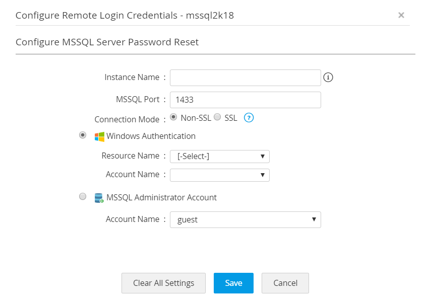 MS SQL サーバーのパスワードのリセットは JDBC 経由で行われるため、MS SQL 管理者の認証情報、または SQL サーバーのパスワードを変更するための十分な権限を持つドメイン アカウントの認証情報を提供する必要があります。MS SQL サーバーのパスワードのリモート リセットを有効にするには、次の手順に従ってください: