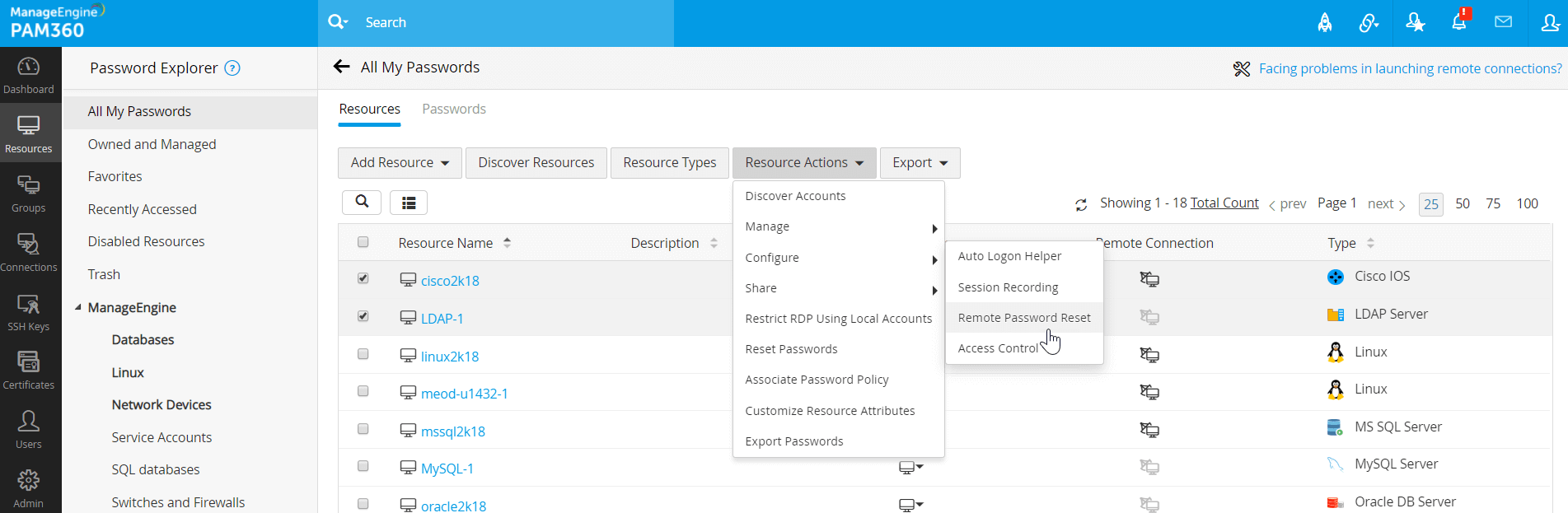 PAM360には、一定のリソースタイプのパスワードをリモート変更するオプションがあります。一般的に、コマンドラインインターフェイス(CLI)から到達できるデバイスでは、PAM360でリモートパスワードリセットを構成し、パスワード管理のコマンドを承認できます。リソースのリモートパスワードリセットについての詳細をもっと読む。